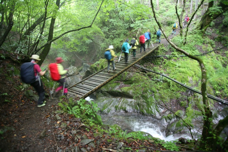 ここの橋は、ていねいに造られています。強度も重要ですが、滑り止めがもっと重要です。日帰りの一般的な低山歩きで「ものすごく危険」という場面があるとすれば、その第一に「濡れた木の橋」を掲げなくてはいけません。滑った後のことを想像すると、命に関わる危険にも直結していますから。私はそういうときのために、靴を濡らして徒渉することもいといませんし、非常用の軽アイゼンを常時携行しています。一歩でも危険なら使います。