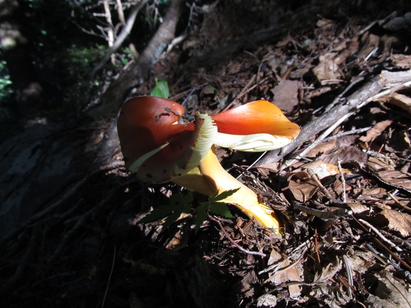 尾根道が終わって、植林地をジグザグに下る道が始まりました。標高差であと200mの下りです。こういう勾配の小さな大きなジグザグ道は「距離が長くなる」という感じがしますが、道の状態がよければ下りのスピードは驚くほど速くなります。この写真のような道なら1時間に600m以上下れます。