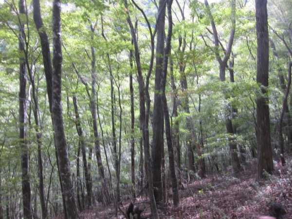 こういう雰囲気、下山が最終段階になるとしばしば体験するのですが、なんというか、手入れをした人の考えどおりに作られたジグザグ道、という印象が強いのです。山裾に住む人達の日常の視野の中にあるからでしょうか、植林地であれ、雑木林であれ、人の手が行き届いている道になったという感じがするのです。あと少し、という気分になります。