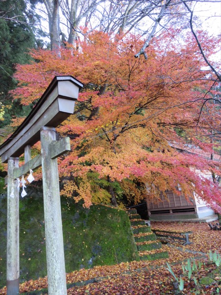 予定より早く下山。そこに待っていたのは 赤い鳥居。そして たっぷりと敷き詰められた色とりどりの落ち葉。