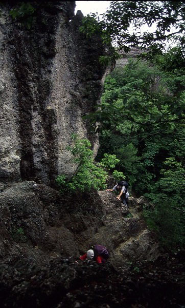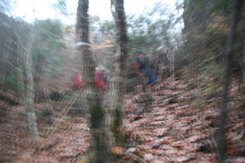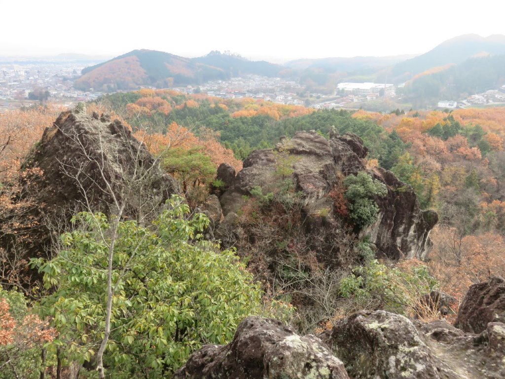 行きの電車の中では 雨が 電車を濡らし 計画が 危ぶまれたが 予定通り 決行。歩き始めると 青い空も見え始めた。私の友人二人の大事なデビュー戦。何とか 雨にならないで無事に終わって欲しい。でも 少し前までは かなりの雨が降り 岩山は 濡れていて 苔の生えている所もあり 難易度かなりアップ。最初の岩を登った所からの一枚。紅葉は 殆んど終わってます。ここで もう すでに お昼を過ぎてます。