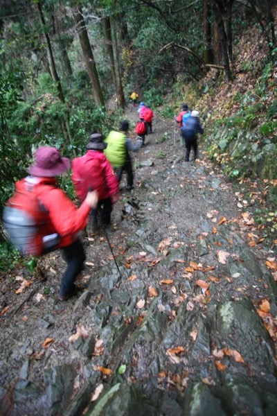 甲州街道(国道20号)の千木良バス停のところから登り始めることもできるのですが、まずはとっかかりの急登。高尾山と大阪の箕面を結ぶ東海自然歩道もまさにこの道です。