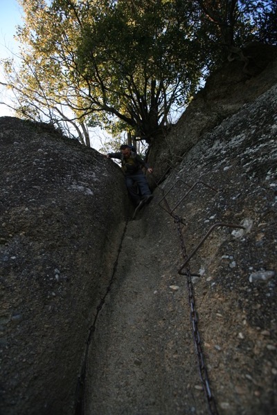 これがクサリ場の最上部から踊り場へと降りるところ。「三点支持」のできない人にはそうとう危険なところで、この状態で下から足場を指示しないとちょっと怖い場面もありそうです。もしドジると、たぶん止まらずに行ってしまいます。初心者の場合はロープで確保してクサリ場通過のきちんとした体験の場と考えるほうが安全で合理的です。クサリ場初心者がいる場合は、巻道を選ぶことも可能です。