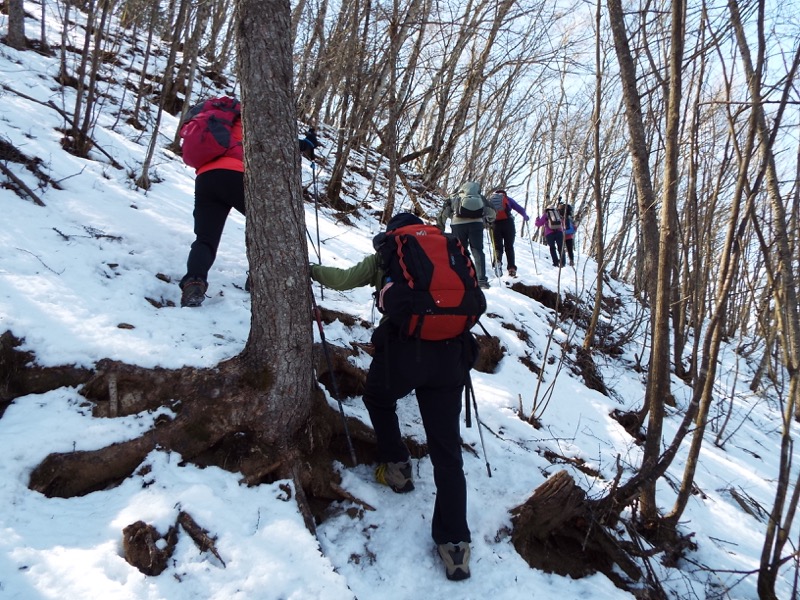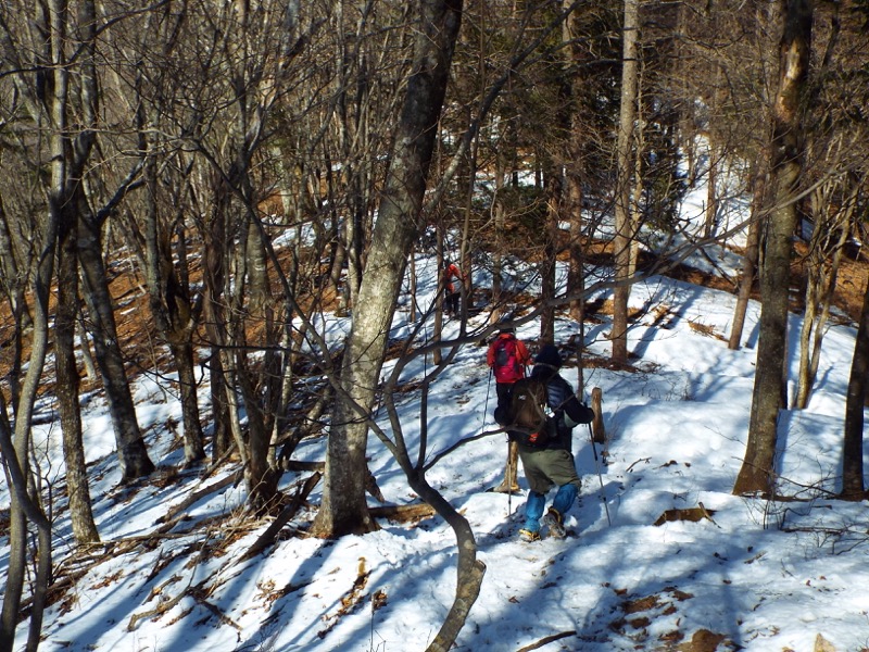 雪がパラパラと、足元に残っています。標高約1,100mあたりでこの状態、標高にして、あと500m以上登ります。周囲の山には雪面が見えますから、雪の状態によってはやっかいな場所も登場するかもしれません。