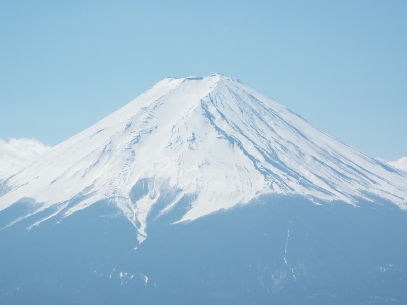 また富士山が見えました。富士山は表側というべき駿河湾側(たとえば東海道)から見ると左側(西)が急斜面で右側(東)が山裾を長く広げています。ところが北側から見る富士山は左右に、のびやかな裾野を広げているため、優美な姿に見えます。