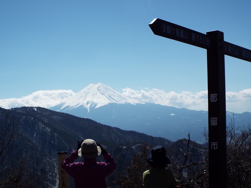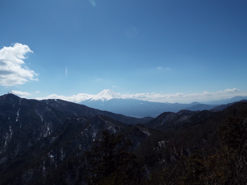眼前に三ッ峠山があります。3つの峰からなる三ッ峠山の最高峰・開運山が左奥に見えています。手前にあるのが御巣鷹山、一番低い木無山は開運山の陰になります。