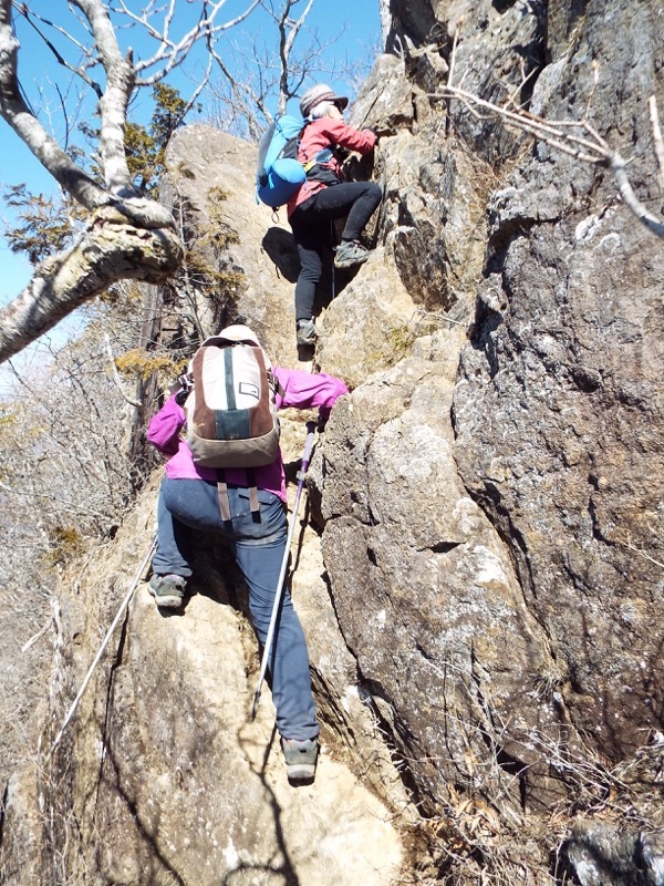こういう岩場の通過は縦走路ではごく一般的なことです。放っておけばみなさん、どんなふうにでも通過していきます。でも入門編として、きちんとした三点支持を教わっておくことが重要だと考えます。自己流でも登れてしまうのですが、三点支持という面倒くさい方法をとるとどこがどう安全かという技術的考え方を、こういう易しところでも使えるように、身に着けておいてほしいのです。