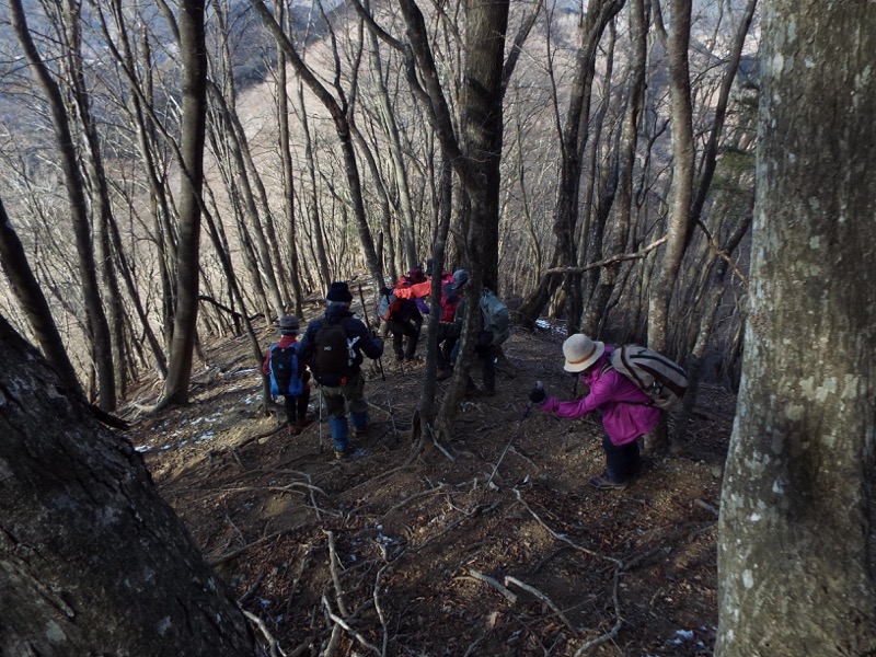 じつは14時30分に、怪しい道を下り始めたのです。以前、快適に歩いていたら踏み込んでしまった道で、下り始めたところに登山者が落としたらしいピルケースがありました。それで安心して下り始めたのですが、道はすぐに怪しくなって、みなさんを留めて、稜線まで戻ってみると、縦走路からあやしい道に踏み込んでしまったことが明らかになりました。笹子駅へと下る道は(地形図にはもともとありませんでしたが)、その先に見つかりました。