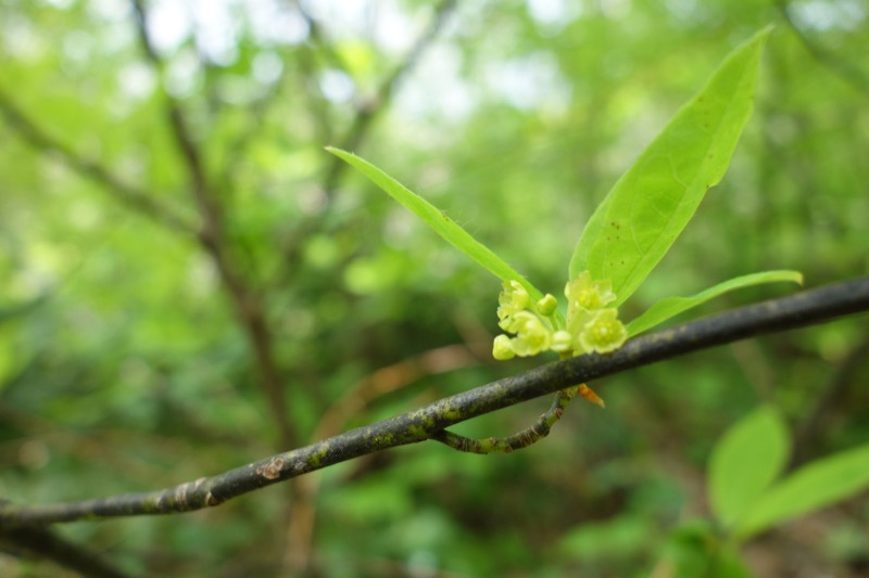 *何の花か分かりませんが、ハナイカダでもヒョウタンボクの仲間でもないと思います。ハナイカダは葉の真ん中に花(雄あるいは雌)が付くし、ヒョウタンボクの仲間は葉に大きな鋸歯はないようなので。