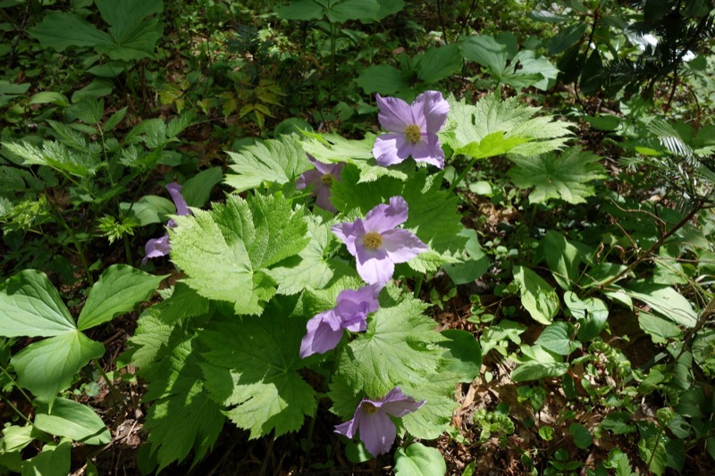 「4月 フクジュソウ、オオミスミソウ(雪割草)に始まりショウジョウバカマ、キクザキイチゲ、5月にはオオタチツボスミレ、エチゴキジムシロ、足の踏み場もない程に咲くカタクリやニリンソウ、ひっそりとヒトリシズカも捨てがたい。何より自慢の高山の花、シラネアオイの群落は日本一ともいわれてる。その他ヤマシャクヤクやサンカヨウも可憐な風合いを見せている。尾根筋にはザゼンソウも群落をなしている」