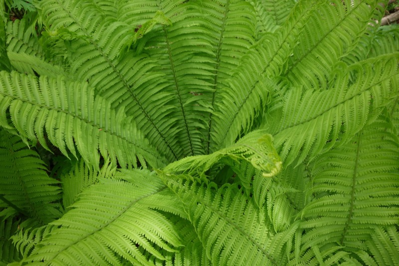 美しいシダ? でも、茎が凹型をしていたからもしかしたらクサソテツ(コゴミ)。葉の裏にぶつぶつの胞子嚢がないことをチェックし忘れた。
