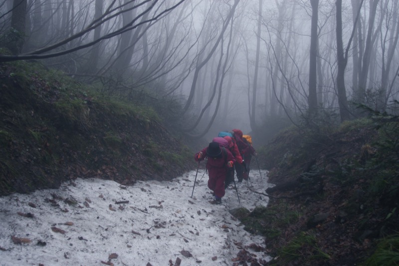 ・1130-40……残雪出現・アイゼン装着休憩(標高約750m)