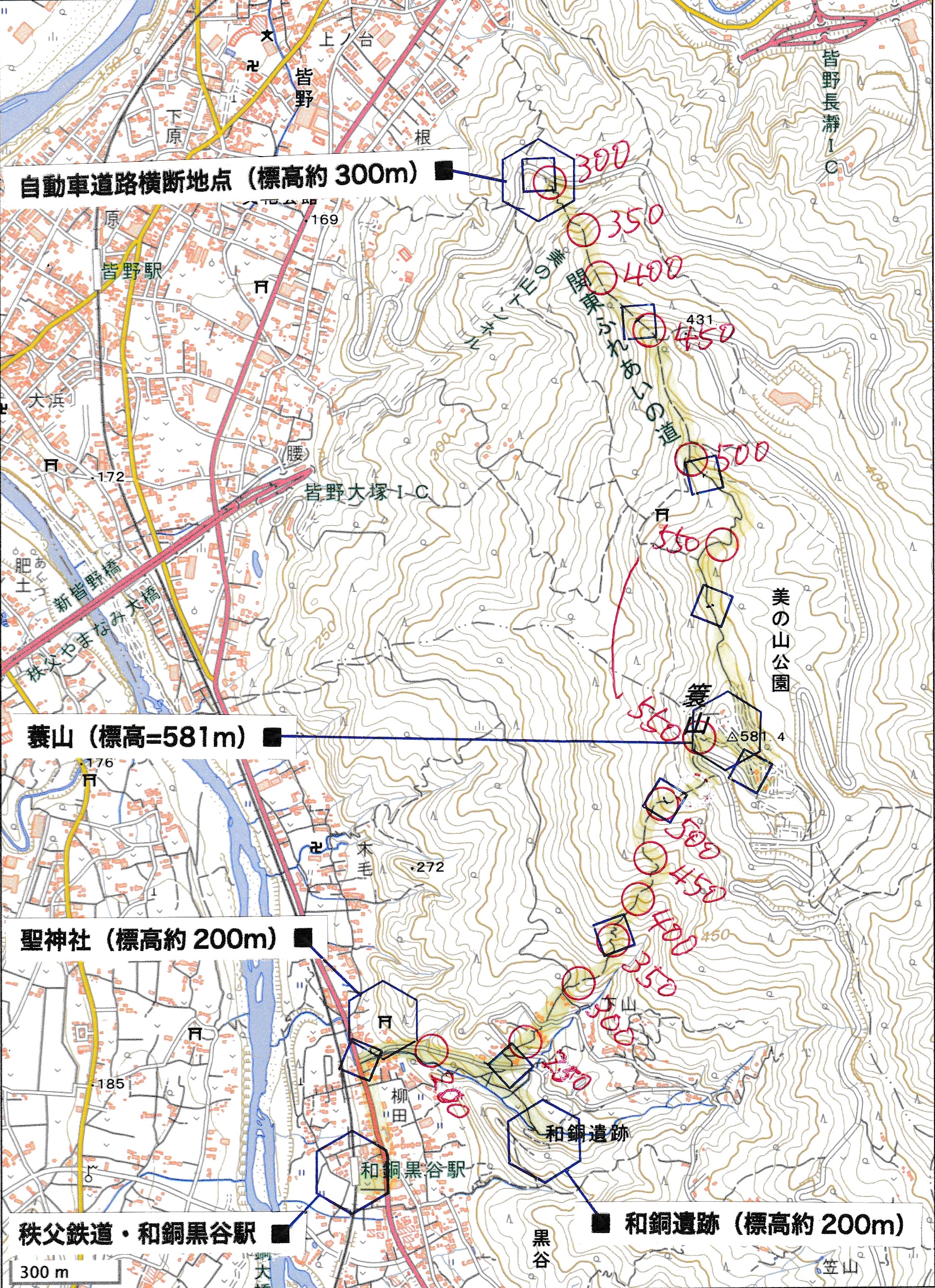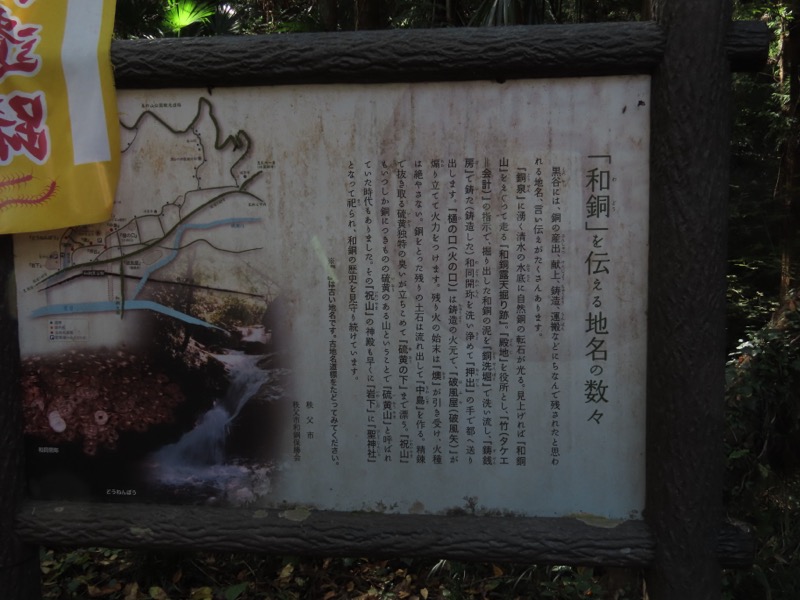 1100-10ごろ_聖神社(ひじりじんじゃ・標高約190m) 1120-25ごろ_和銅採掘露天堀跡(標高約250m) 1140ごろ_集落を抜け、登山道始まる(標高約270m) ────1225-30ごろ_休憩(標高約520m)