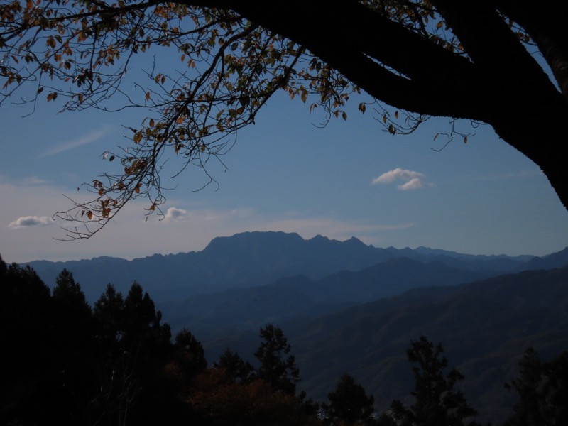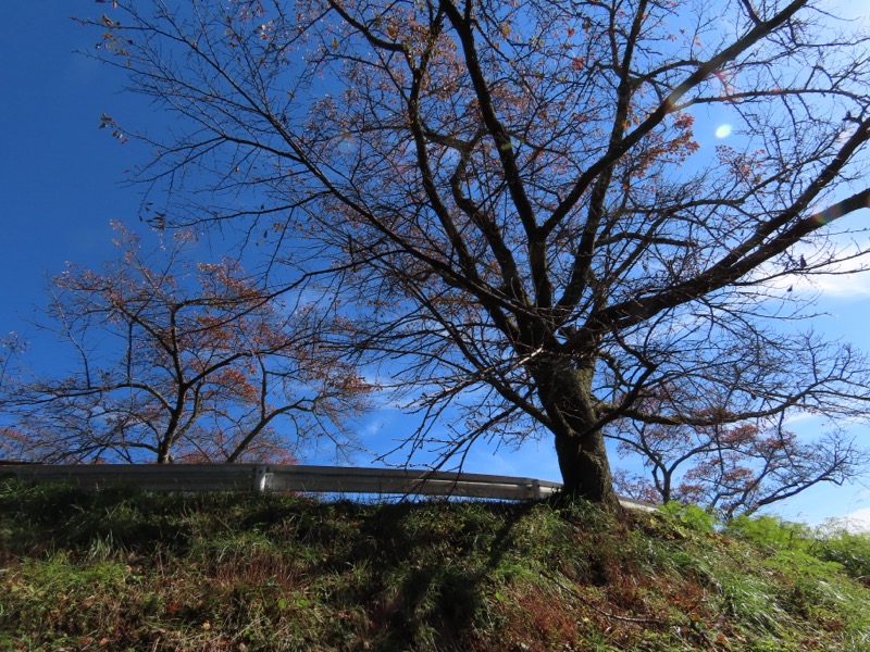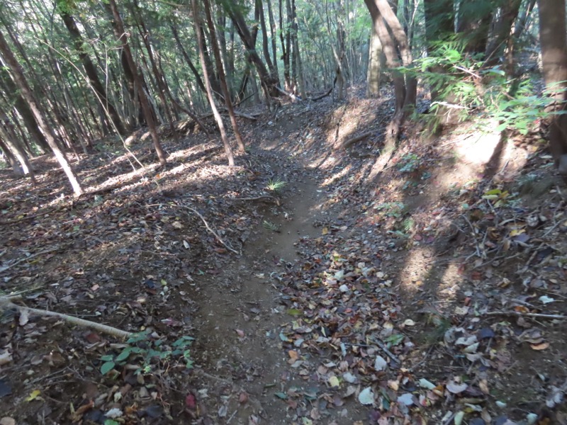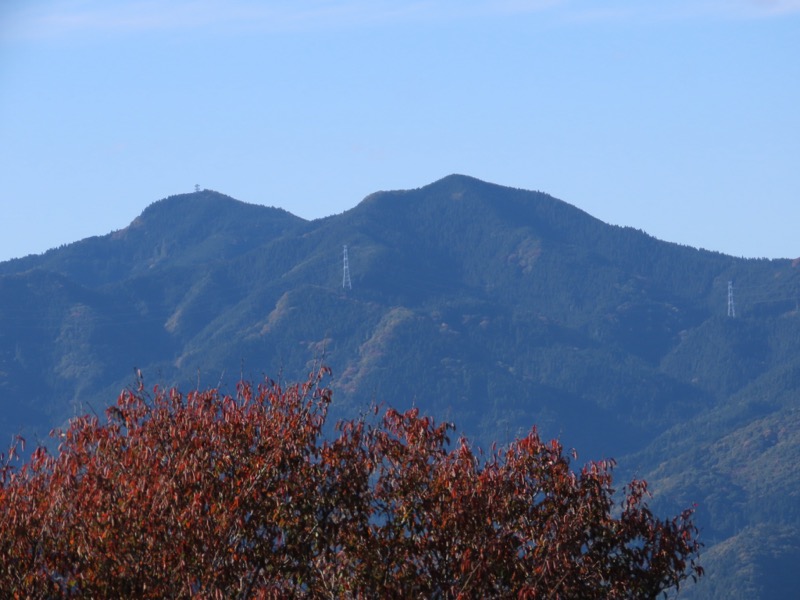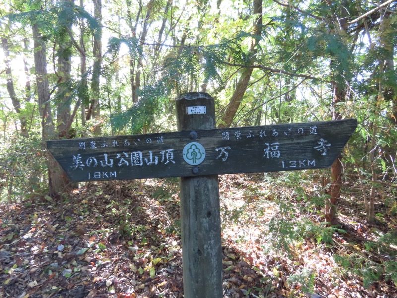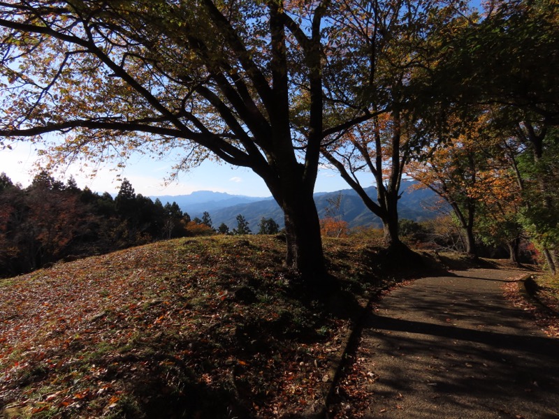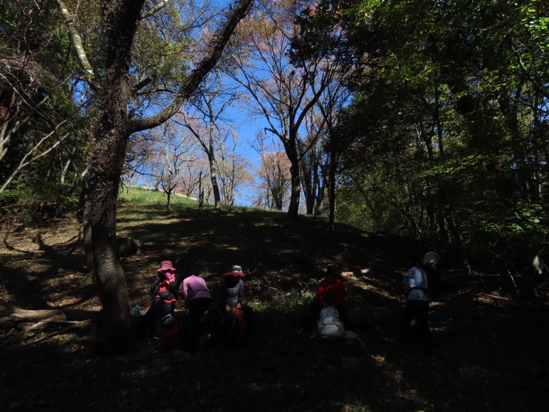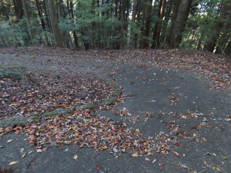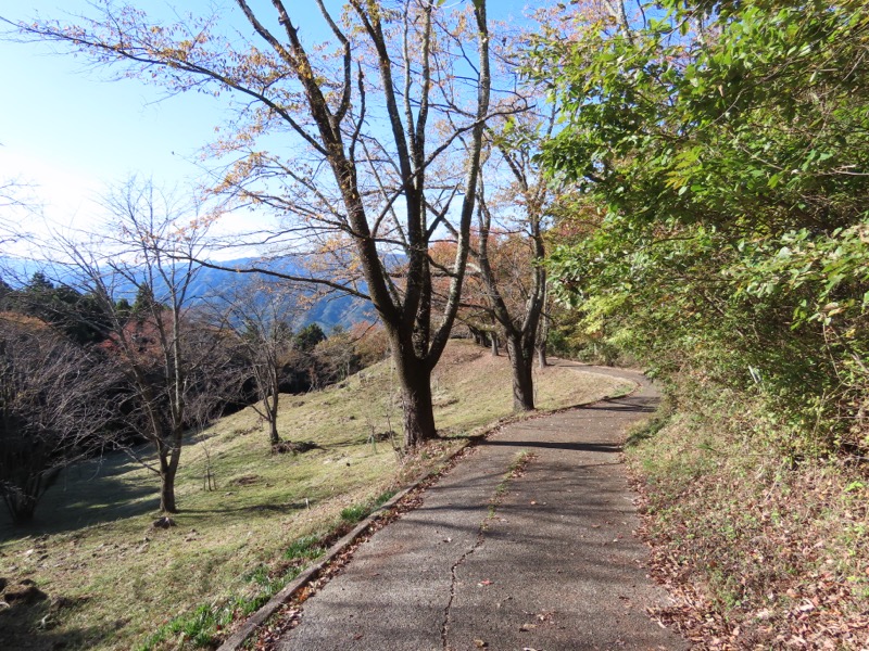 ────1245-1325ごろ_蓑山(美の山)山頂でゆったり休憩(標高=581m) 1355ごろ_関東ふれあいの道の舗装路が登山道に変わる(標高約500m) ────1420ごろ_自動車道を横断。小休憩(標高約280m)