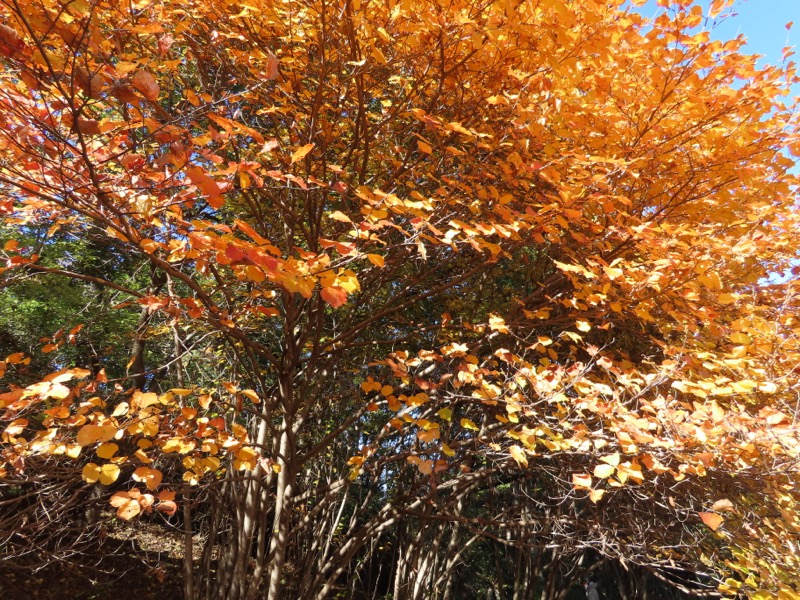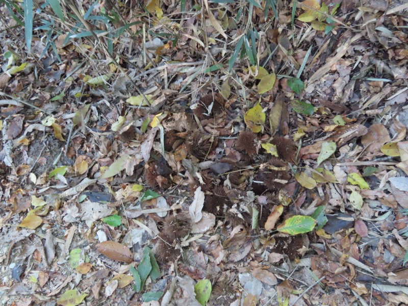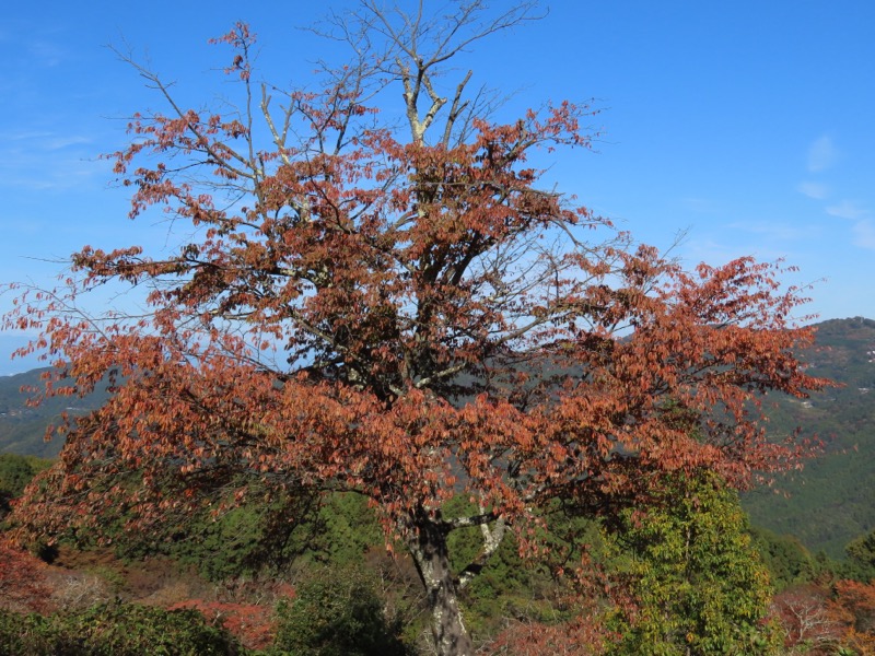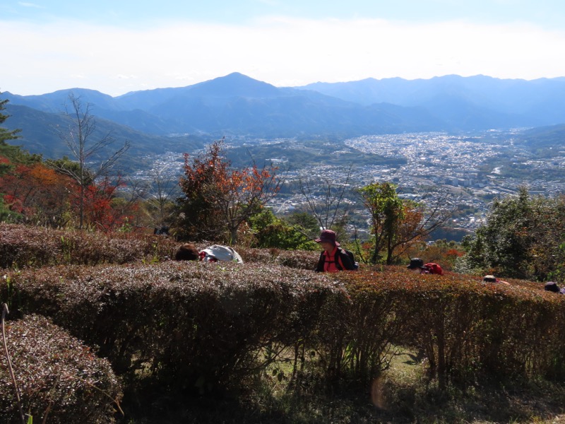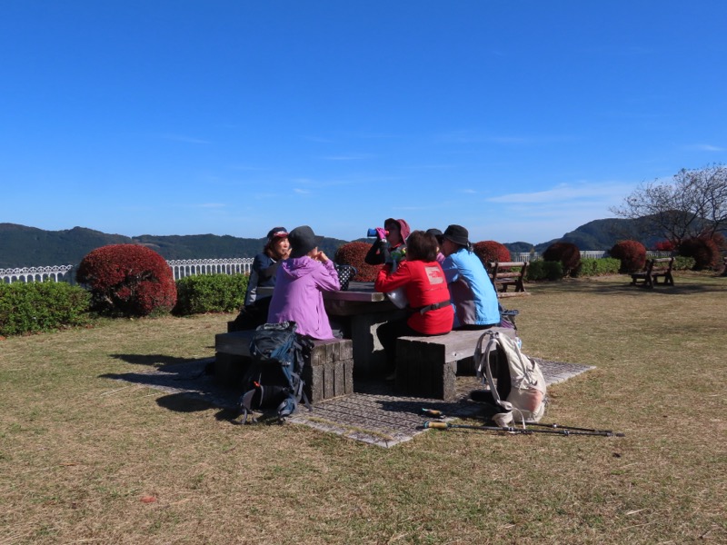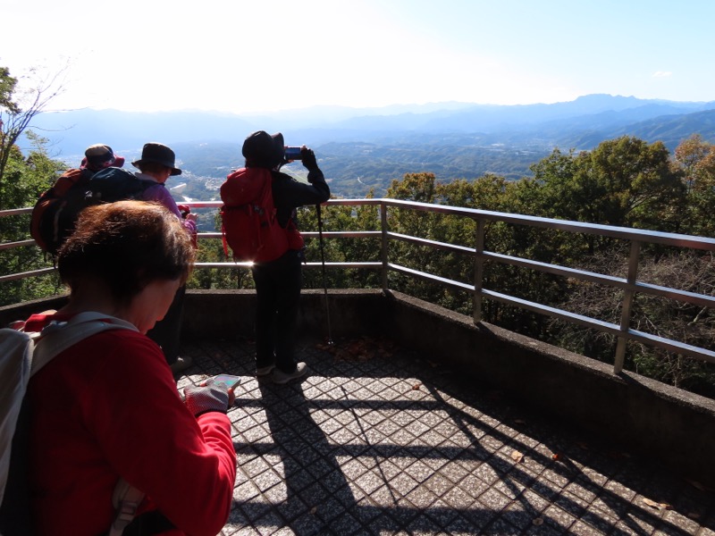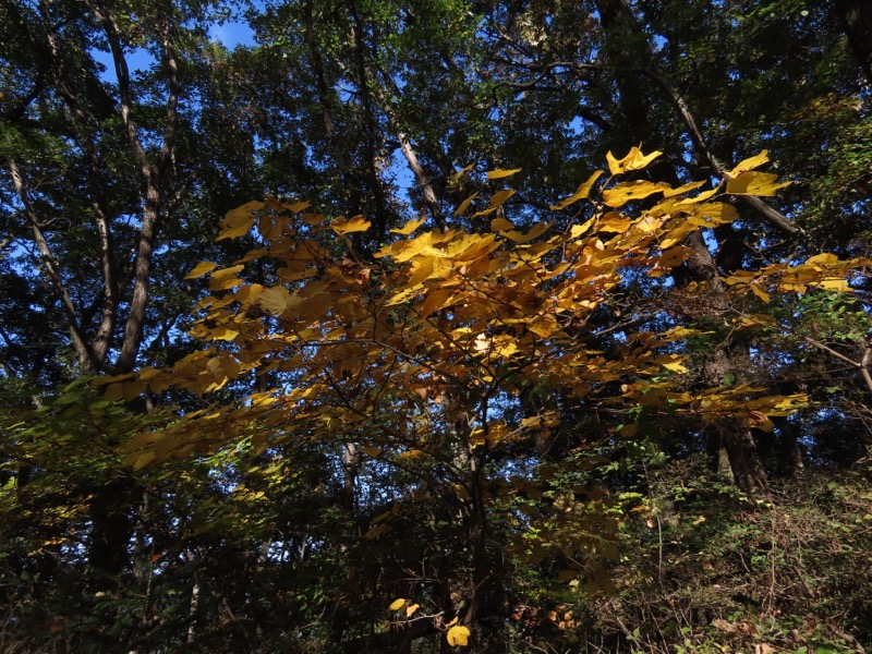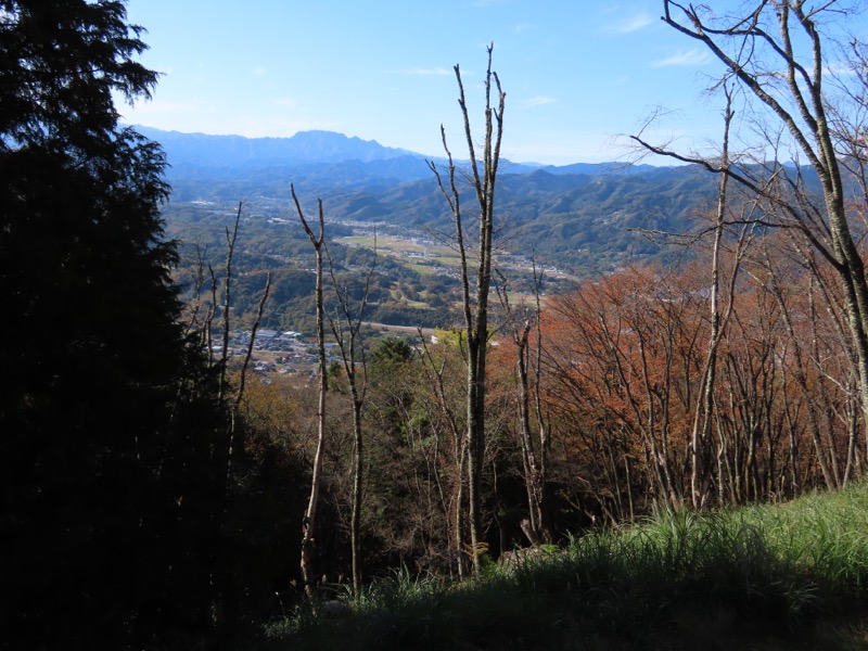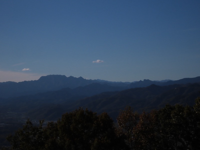 ────1245-1325ごろ_蓑山(美の山)山頂でゆったり休憩(標高=581m) 1355ごろ_関東ふれあいの道の舗装路が登山道に変わる(標高約500m) ────1420ごろ_自動車道を横断。小休憩(標高約280m)