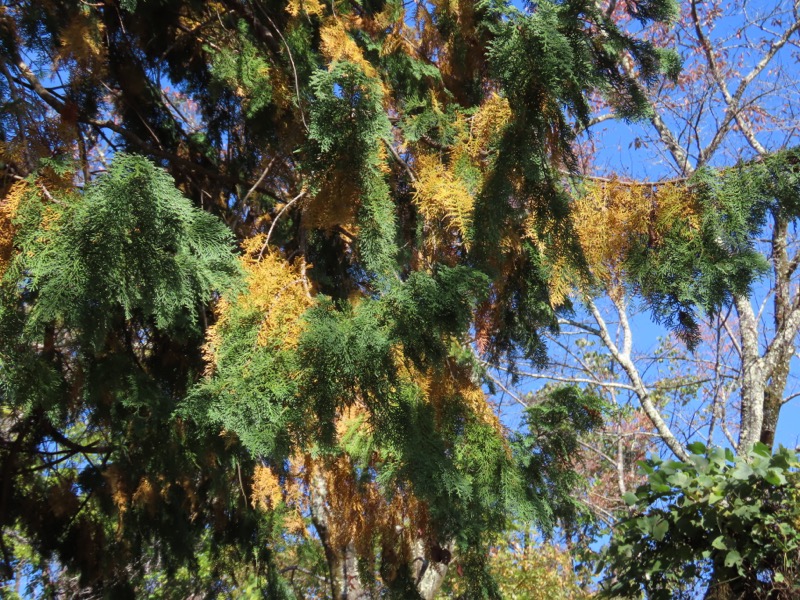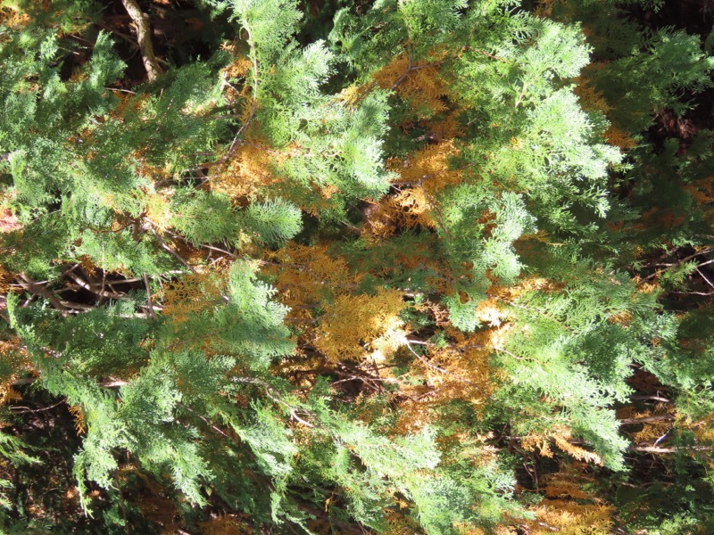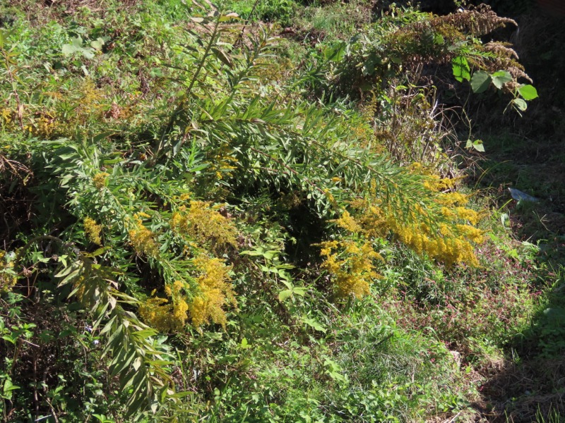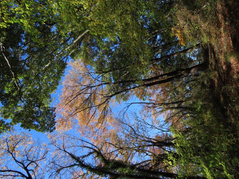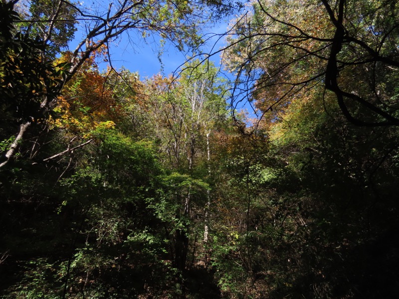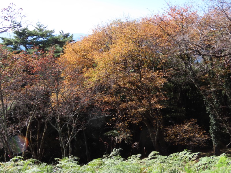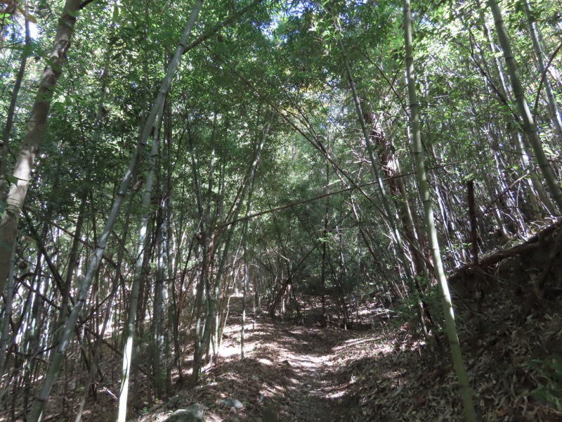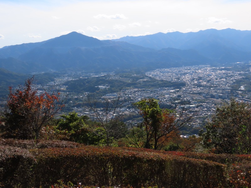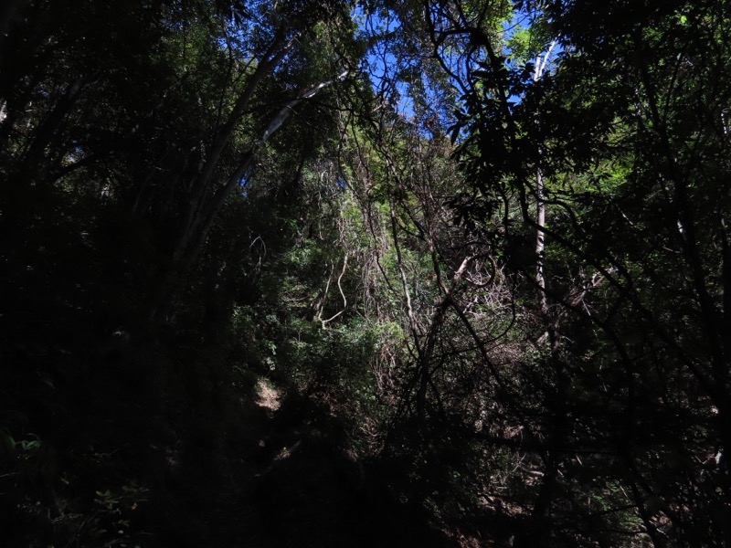 ────1245-1325ごろ_蓑山(美の山)山頂でゆったり休憩(標高=581m) 1355ごろ_関東ふれあいの道の舗装路が登山道に変わる(標高約500m) ────1420ごろ_自動車道を横断。小休憩(標高約280m)