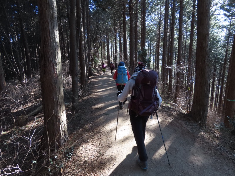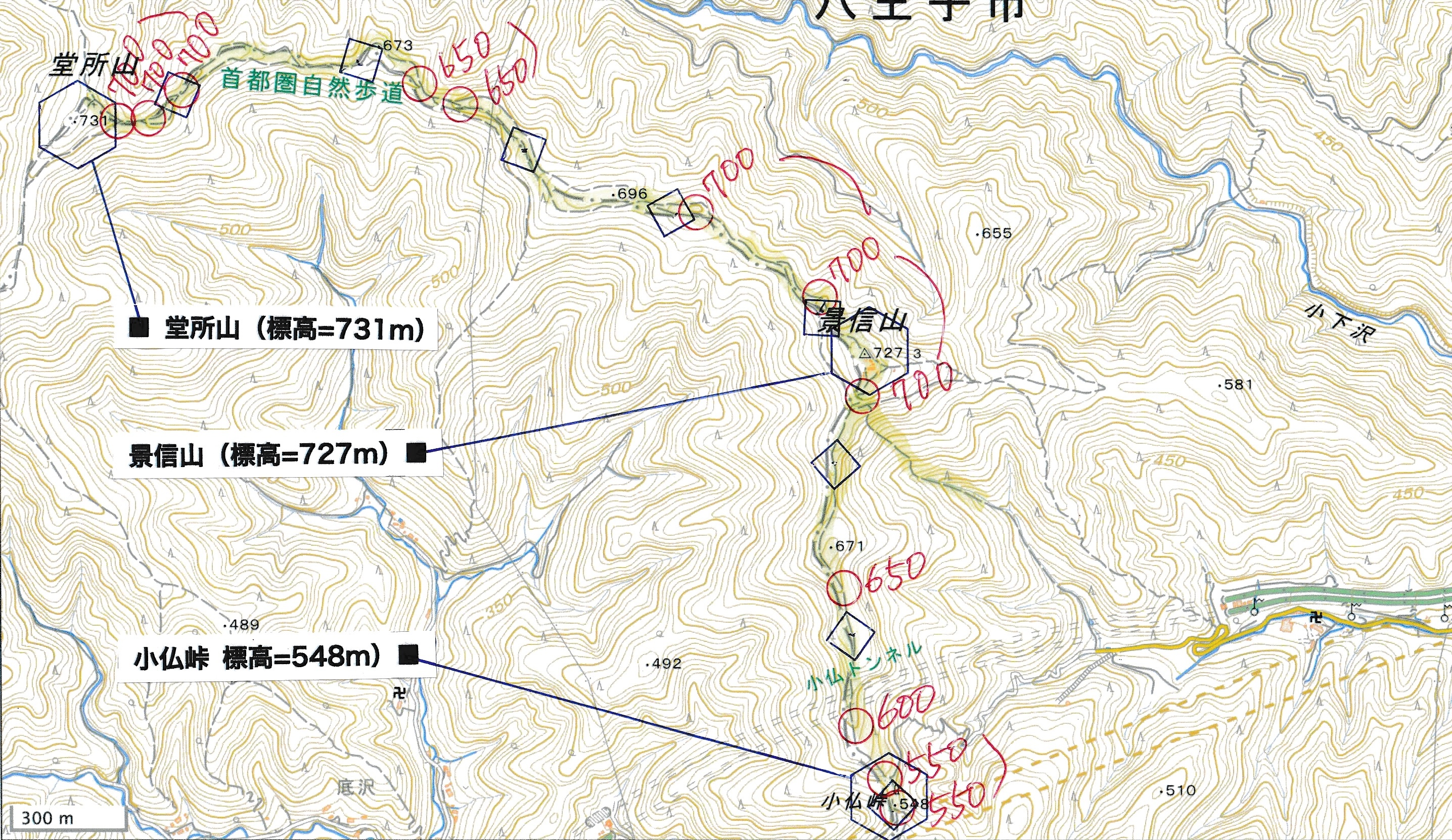 ────1220ごろ_堂所山登り口では巻き道を選択(標高約700m) 1340-55ごろ_景信山(標高=727m) ────1425ごろ_小仏峠(標高約548m)