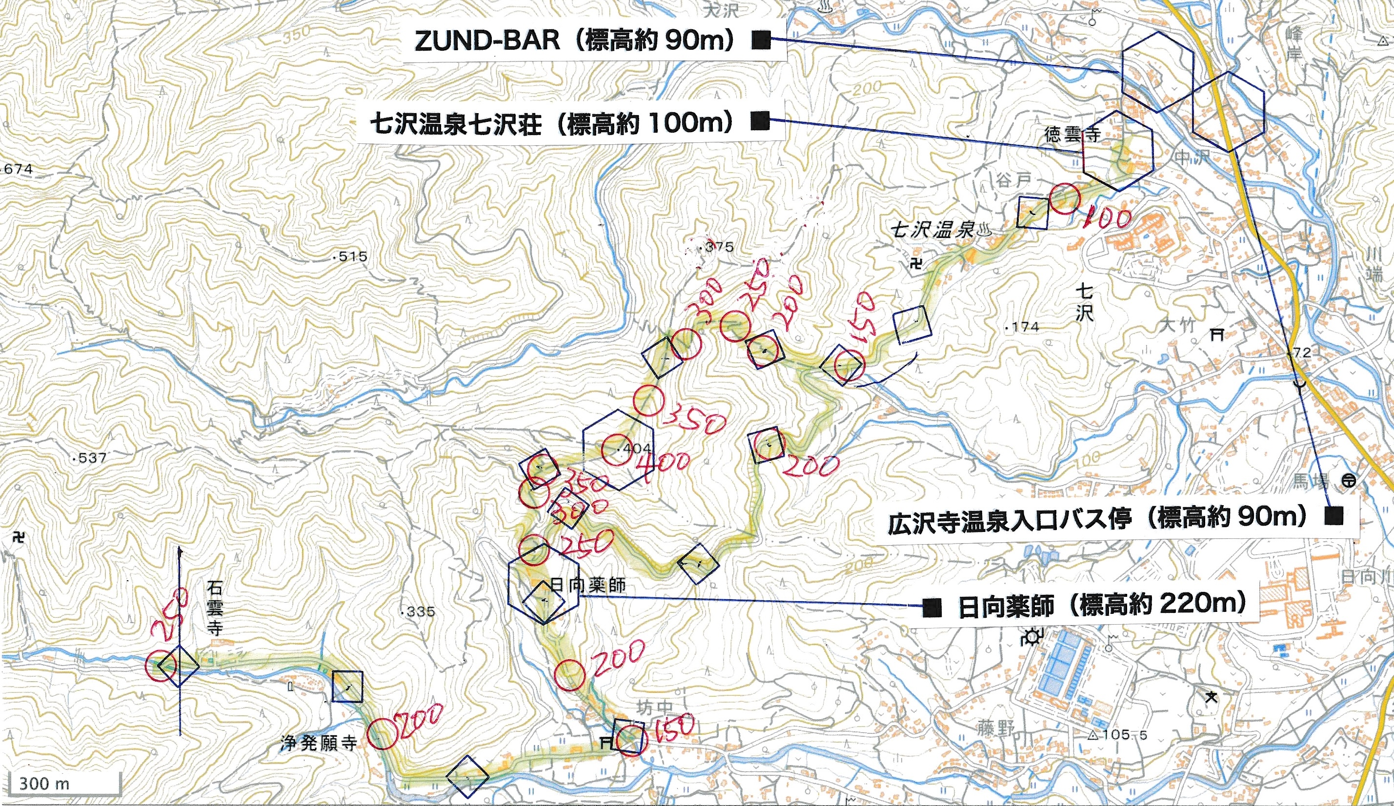 *地図の2枚目は日向薬師から白山に登らずに、巻き道の自動車道を七沢温泉へと進みます。