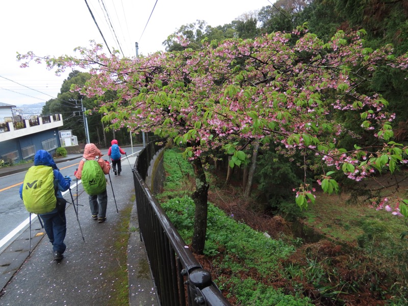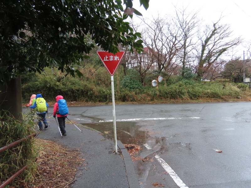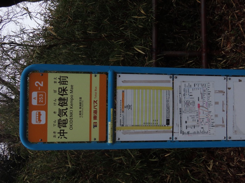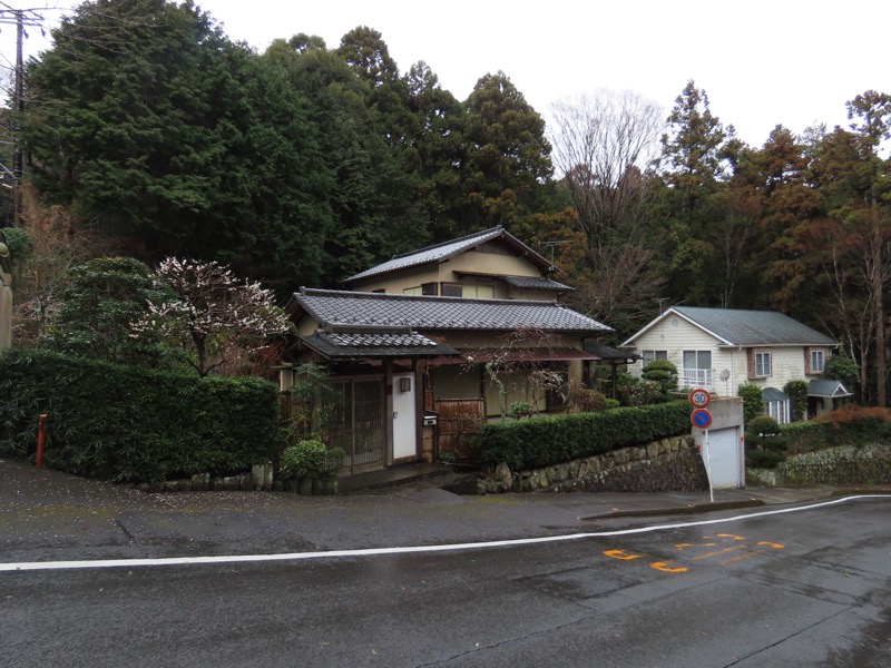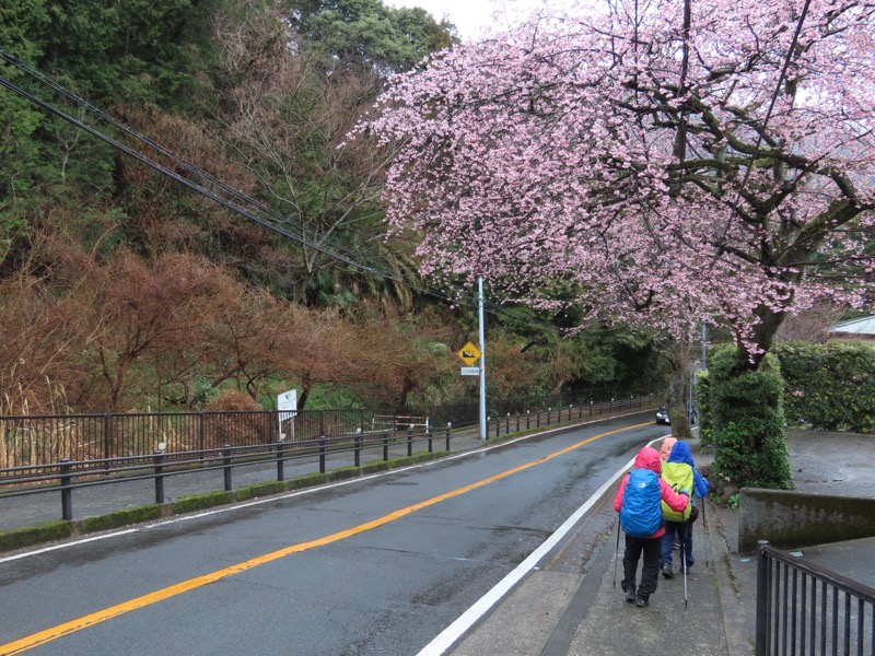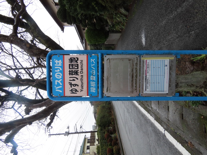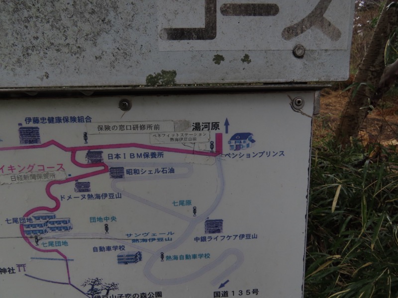 1300ごろ_自動車道路(閉鎖)に出る(標高約460m) 1305ごろ_ゲートを出て保養施設群の道路となる(標高約460m) 1310ごろ_保養内内の分岐「泉・湯河原方面」と「伊豆山神社」方面(標高約430m) 1320ごろ_「沖電気健保前」バス停。すぐ先のT字路が県道十国峠伊豆山線(標高約390m) *県道のT字路(右が伊豆山方面、左が湯河原方面)を越えて湯河原の千歳橋へと下るルートをきちんとさがすべきだったのに、「岩戸山ハイキングコース」という案内板の指示どおりに県道を「湯河原方面」へとたどることにしてしまった。 ────1400ごろ_県道はゆずり葉団地(ゆずり葉団地バス停)へと下った(標高約280m)