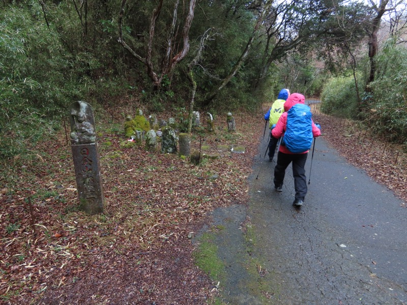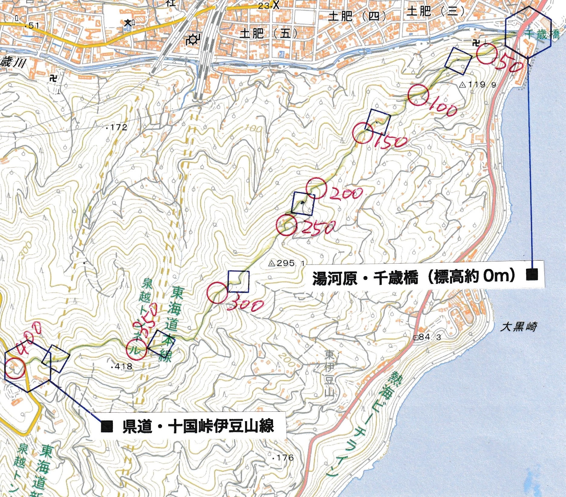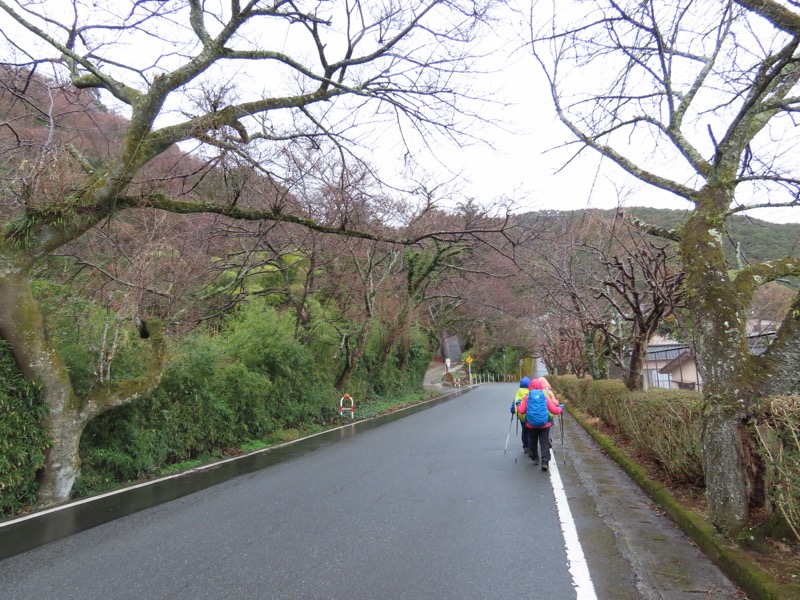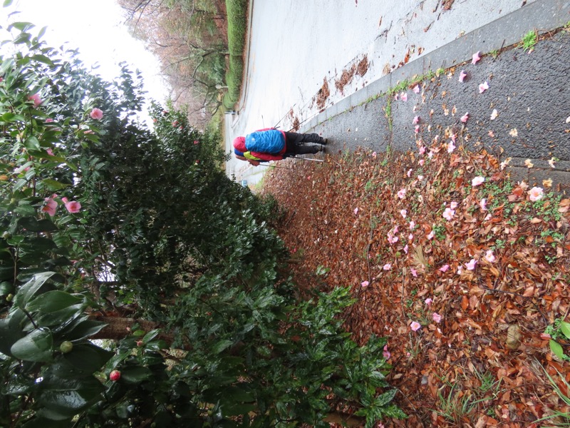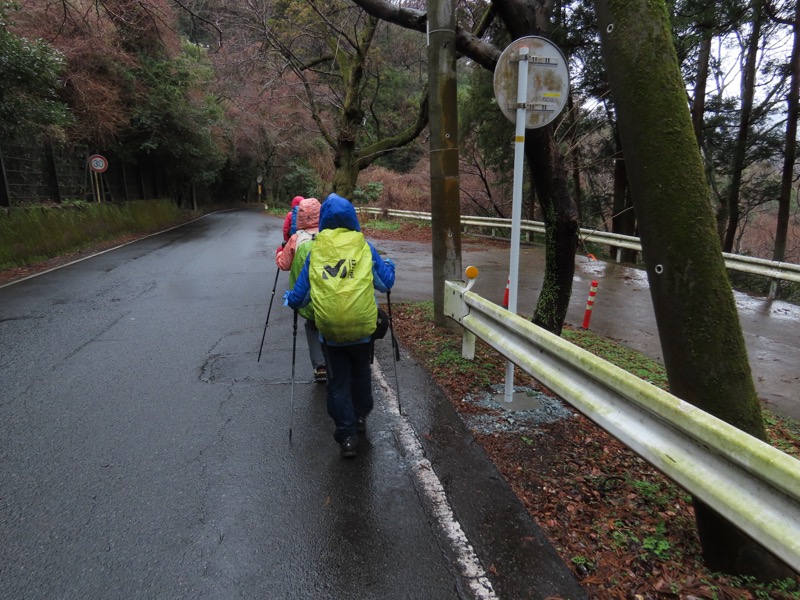 1300ごろ_自動車道路(閉鎖)に出る(標高約460m) 1305ごろ_ゲートを出て保養施設群の道路となる(標高約460m) 1310ごろ_保養内内の分岐「泉・湯河原方面」と「伊豆山神社」方面(標高約430m) 1320ごろ_「沖電気健保前」バス停。すぐ先のT字路が県道十国峠伊豆山線(標高約390m) *県道のT字路(右が伊豆山方面、左が湯河原方面)を越えて湯河原の千歳橋へと下るルートをきちんとさがすべきだったのに、「岩戸山ハイキングコース」という案内板の指示どおりに県道を「湯河原方面」へとたどることにしてしまった。 ────1400ごろ_県道はゆずり葉団地(ゆずり葉団地バス停)へと下った(標高約280m)