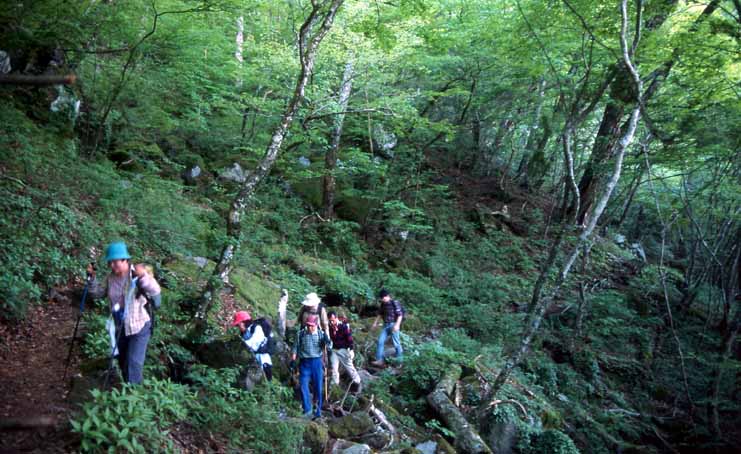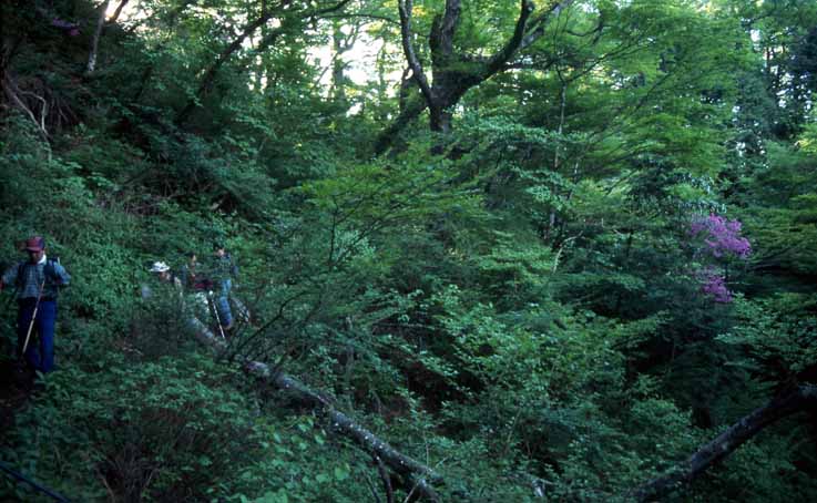 ●翌年の1996年は5月25日に糸の会で行きましたが花ほとんど完全にゼロ、というだけでなく花芽もほとんどない状態でした。不作の極みという年であったようです。ただ、私たちは万三郎岳から先で素晴らしく贅沢な山歩きを楽しむことができました。