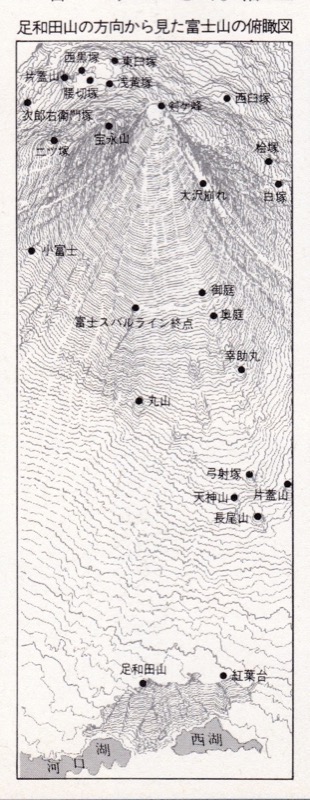 *これは1985年のムック『富士山・全案内』(朝日新聞社)のために描いた鳥瞰図。3方向から見た富士山で、中央の図を見ると吉田口登山道は画面中央の「富士スバルライン終点」からすこし左に巻いて、そこからまっすぐ登っていきます。