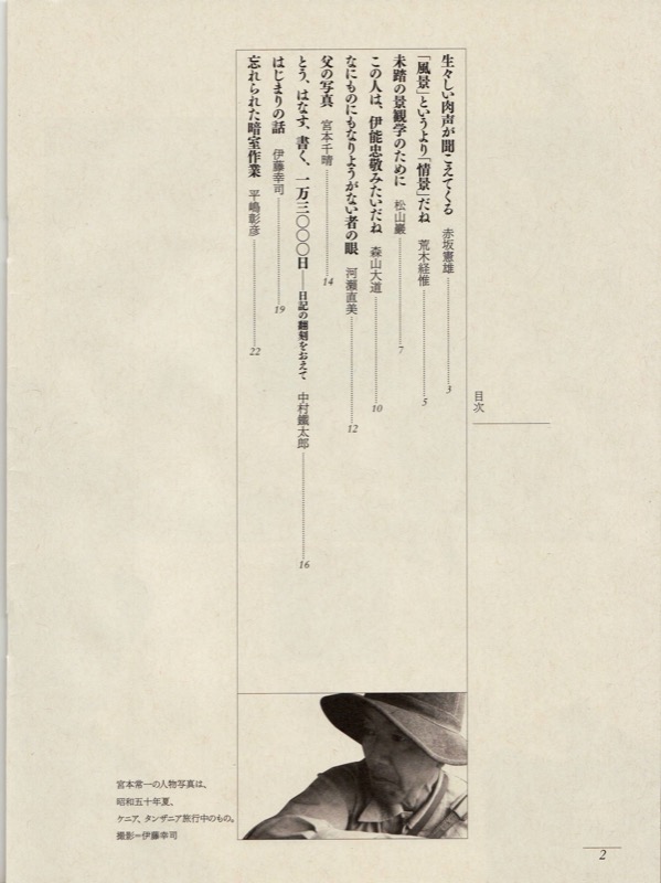 *制作は2001年の夏から準備が進められてきました。亡くなって20年以上になる民俗学者宮本常一先生の未整理の(といっても基本的な整理はなされていた)写真(昭和30〜56年)をまとめる作業が進むうちに、未発表の日記(昭和20-56年)も出てきたので、それもすべて翻刻することになりました。毎日新聞社の平嶋彰彦さんが写真によって宮本常一と向かい合い、詩人の中村鐵太郎さんが日記によって宮本常一と向かい合うという真剣勝負をわきでたっぷり観戦というのが私の役目となったのです。