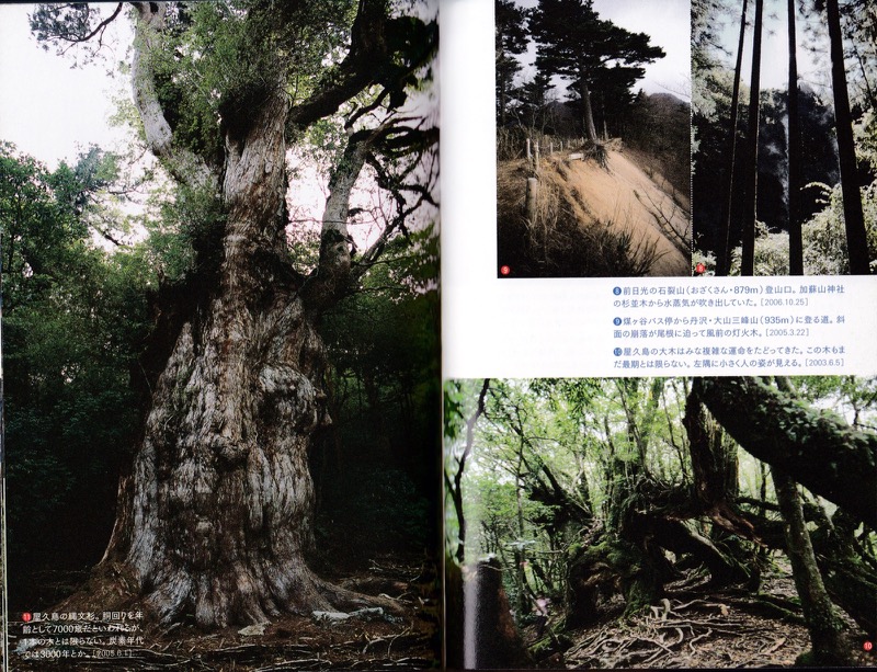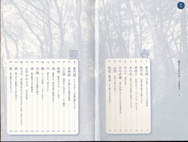 *目次立ては、【春】1春の道、2春の花、3芽吹き、4木の花、5カエル、6木の肖像、7山里、8残雪/雪渓、【夏】9夏の道、10自然林、11人工林、12休憩、13滝、14川、15橋、16池・湖、17海、18シカ・サル・クマ、19チョウ、20雨、21雲、【高山】22朝の光、23山頂で、24ブロッケンの妖怪、25お花畑、26ライチョウ/カモシカ、27山小屋、28避難小屋/テント、29槍ヶ岳、【秋】30秋の道、31実り、32虫、33岩のかたち、34岩場、35クサリ場、36信仰のしるし、【冬】37冬の道、38雪遊び、39下界の風景、40夕、41鳥、42富士山、43宿、44湯。