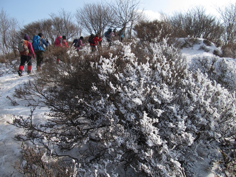 山頂稜線の霧氷は谷川岳など上越の山々を越えてきた過冷却の霧が流れたことを記録していました。登る途中で見たのは逆方向にのびていましたから、そこでは風がまわりこんでいたのかとも思います。