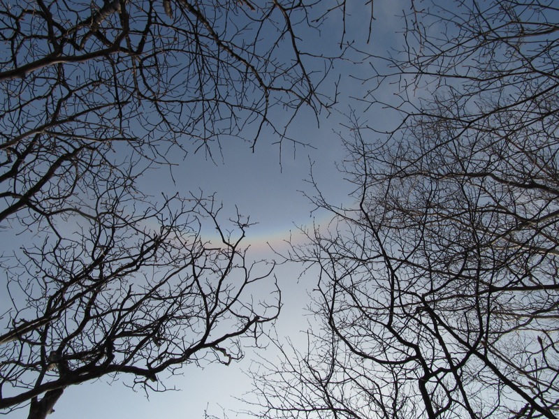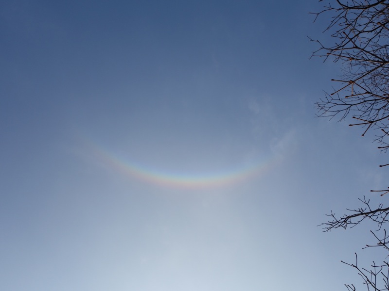 下山途中の休憩時に誰かが「虹!」と騒ぎだした。広い空のどこに虹があるのか必死に探して、やっと見つけた。