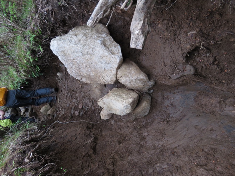 登山道がこのような川になると、もう修理ではおさまりません。異質な感じの石がバラバラと見えますが、(私の想像では)以前、登山者に持ち上げていってもらいたいとしたものだと思われます。