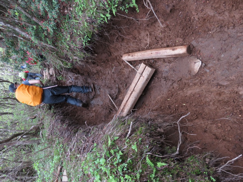 ここで天城山の登山道の決定的な欠点が見えてきました。「歩きやすい道」をつくろうとしたんですね。丸太をていねいに組んで、女性の足にもやさしい階段状の「道路、歩道」を作り上げた、というのが製作者の側。斜面を流れる雨水がその道を発見して自分たちなりに気持ちよく下りながら、こんなふうにリメークしていったのです。