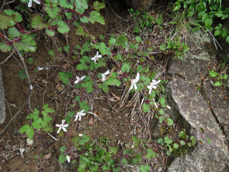 私たちは登山口からまず下りました。左手にゴルフ場が広がっていて、そちらから流れ下る(狩野川←大見川←地蔵堂川←菅引川上流の、たぶん)無名の沢の最上流部を渡りました。ちょうどここまで地形図の青線が引かれているので、常時水が流れているはずですが、この雨模様の空の下でも、涸れ沢になっていました。