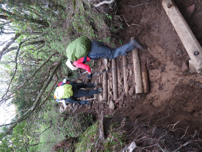 ともかく、このルートでは小さなアップダウンは岩によるものが多いので、濡れた岩がスピードをガクンと落とす主要な原因となっています。私たちは53歳を例外的な若年組として73歳、76歳×2、77歳ですから時間的な余裕とダブルストックを有効に使うことが安全に大きく寄与しています。