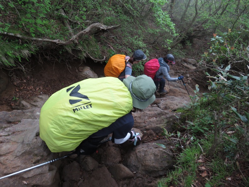 私はコースタイムを決めてそれより早いか、遅いかで評価するつもりはありませんが、今回は私たちに内在したスローペースという原因と、雨は小雨でも、岩の表面は濡れていて、登山道が荒れていたことが重なったように思います。このルートは何度も体験しています、こんなに遅れたことはありませんでした。