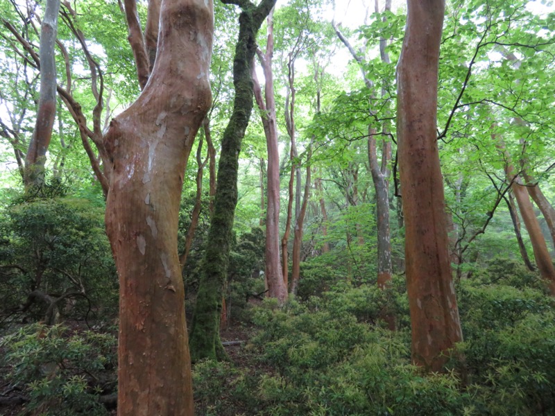 ブナとヒメシャラ、シャクナゲとアセビ。天城の四天王という感じですね。下り口のここにシャクナゲがあったわけですが。万三郎岳山頂から一気下りの昔の道筋ではシャクナゲがずっと楽しめました。