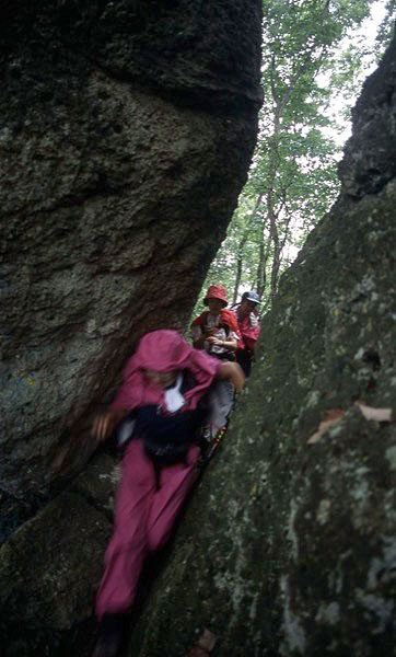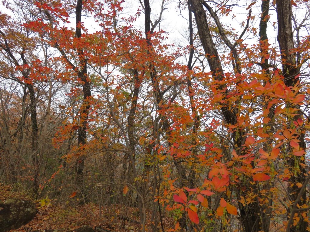 行きの電車の中では 雨が 電車を濡らし 計画が 危ぶまれたが 予定通り 決行。歩き始めると 青い空も見え始めた。私の友人二人の大事なデビュー戦。何とか 雨にならないで無事に終わって欲しい。でも 少し前までは かなりの雨が降り 岩山は 濡れていて 苔の生えている所もあり 難易度かなりアップ。最初の岩を登った所からの一枚。紅葉は 殆んど終わってます。ここで もう すでに お昼を過ぎてます。