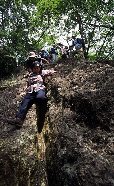 ここを登りきったところが古いガイドブック『栃木の山120』によれば「C峰」。この岩場は大きな危険とは思いませんが、どんな登り方をするか、きちんと見ることができる場所です。合わせて「三点支持」を徹底してもらいます。