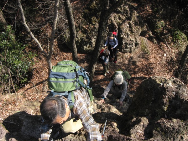 *糸の会の「ダブルストック講座」の実技編として岩山に行きました。計画書には────駅から歩いていける小さな山です。標高328m。小さな岩山ですが、岩場でのダブルストックのさまざまな使い方を体験することができます。それよりもなによりも、岩のテーマパークという感じです。お楽しみに。────と書きました。
