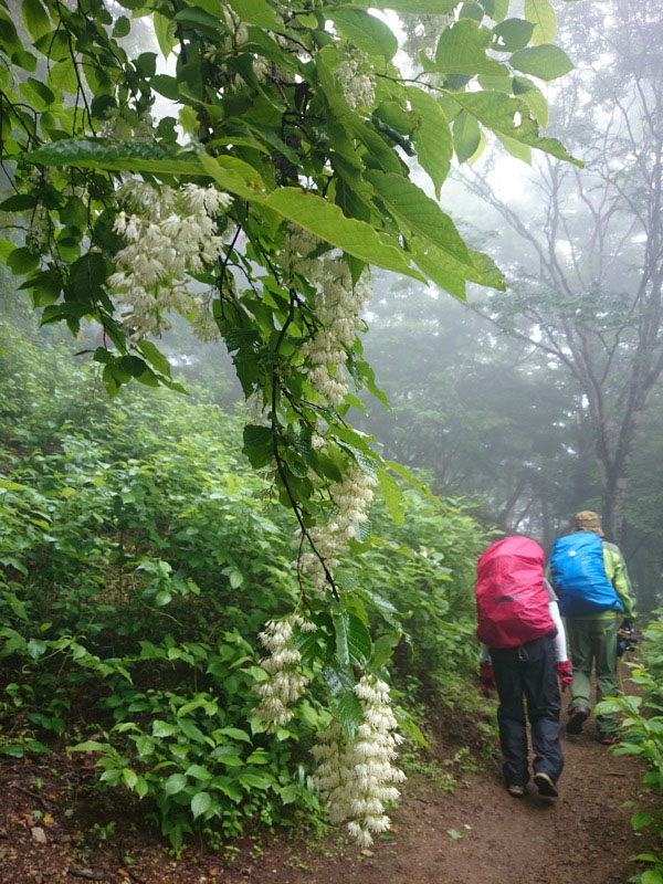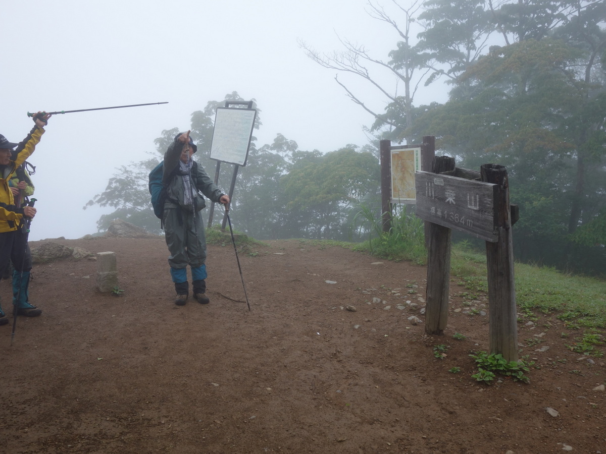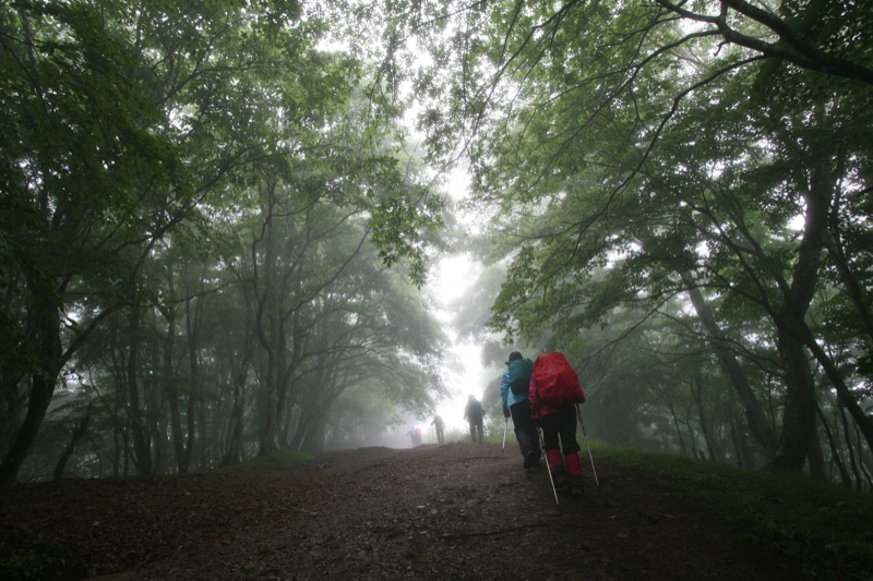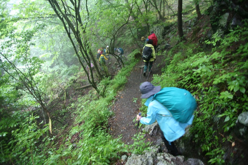 *この日の天気予報は最悪でした。雨に遭わない可能性は0%、つまり梅雨時に、雨具をつけたら外から濡れなくても内側からビッショリという最悪の状況が保証済みでした。私自身も家を出るとき憂鬱でしたから、参加者の皆さんはさぞや……と思っていたら、欠席はひとりも無し。最近、そういうことがしばしばあるので感心します。月に1〜2回の山歩きがその月の「健康」にかかわる重要性が、雨に遭う、遭わないよりも重要だとみなさん考えているのです。