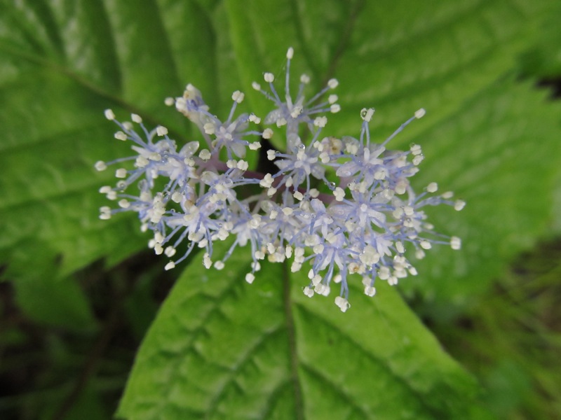 大根ノ山ノ神の先で林道と交差して、登山道は本仁田山方面と川苔山方面とに分かれます。川苔山へダイレクトに向かう道は標高約650mから750mへと高度差100mをおよそ1キロ半かけて登るという緩やかな道になります。そこで私たちはヤマアジサイに迎えられたのです。