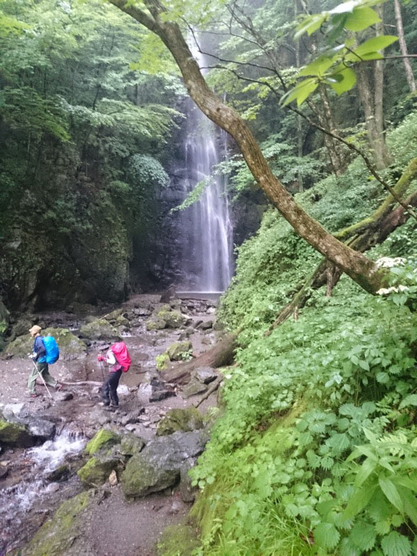 轟きに目をやると、白いしぶきが眩しい小滝。近寄れない分、気持ちがひかれた。