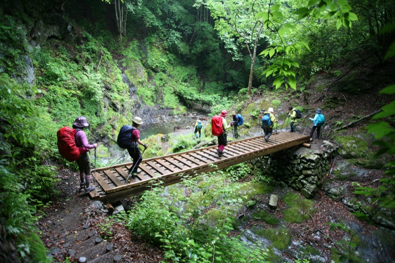 ここの橋は、ていねいに造られています。強度も重要ですが、滑り止めがもっと重要です。日帰りの一般的な低山歩きで「ものすごく危険」という場面があるとすれば、その第一に「濡れた木の橋」を掲げなくてはいけません。滑った後のことを想像すると、命に関わる危険にも直結していますから。私はそういうときのために、靴を濡らして徒渉することもいといませんし、非常用の軽アイゼンを常時携行しています。一歩でも危険なら使います。