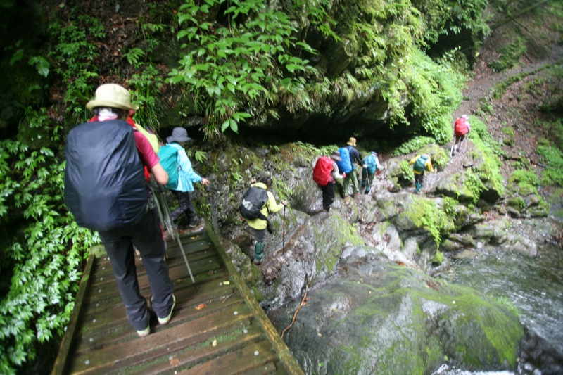 下の岩場より、こっちの木の橋の方が危険だと考えます。とくに板の上面をきれいに踏んで歩く人が危険です。接地面積が小さいので、重心がちょっとずれただけで足をすくわれます。あえて重心をずらして、つま先とかかとが異なるふたつの点を踏む状態にすることが必要です。ここでも「2種類のものを踏む」という原則で歩いています。