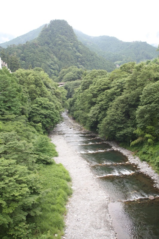 ここでは奥多摩工業氷川工場方面へと入る橋から日原川の下流側を見ています。川の流れを遮るような石積みの線は、たぶん釣客向けの施設だと思います。正面にそびえているのは愛宕神社のある愛宕山。標高449mまで、187段の階段で一気登りです。鋸山を経て御前山や大岳山への縦走路となっています。