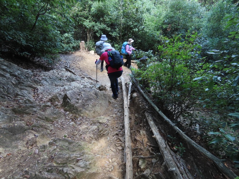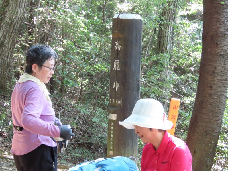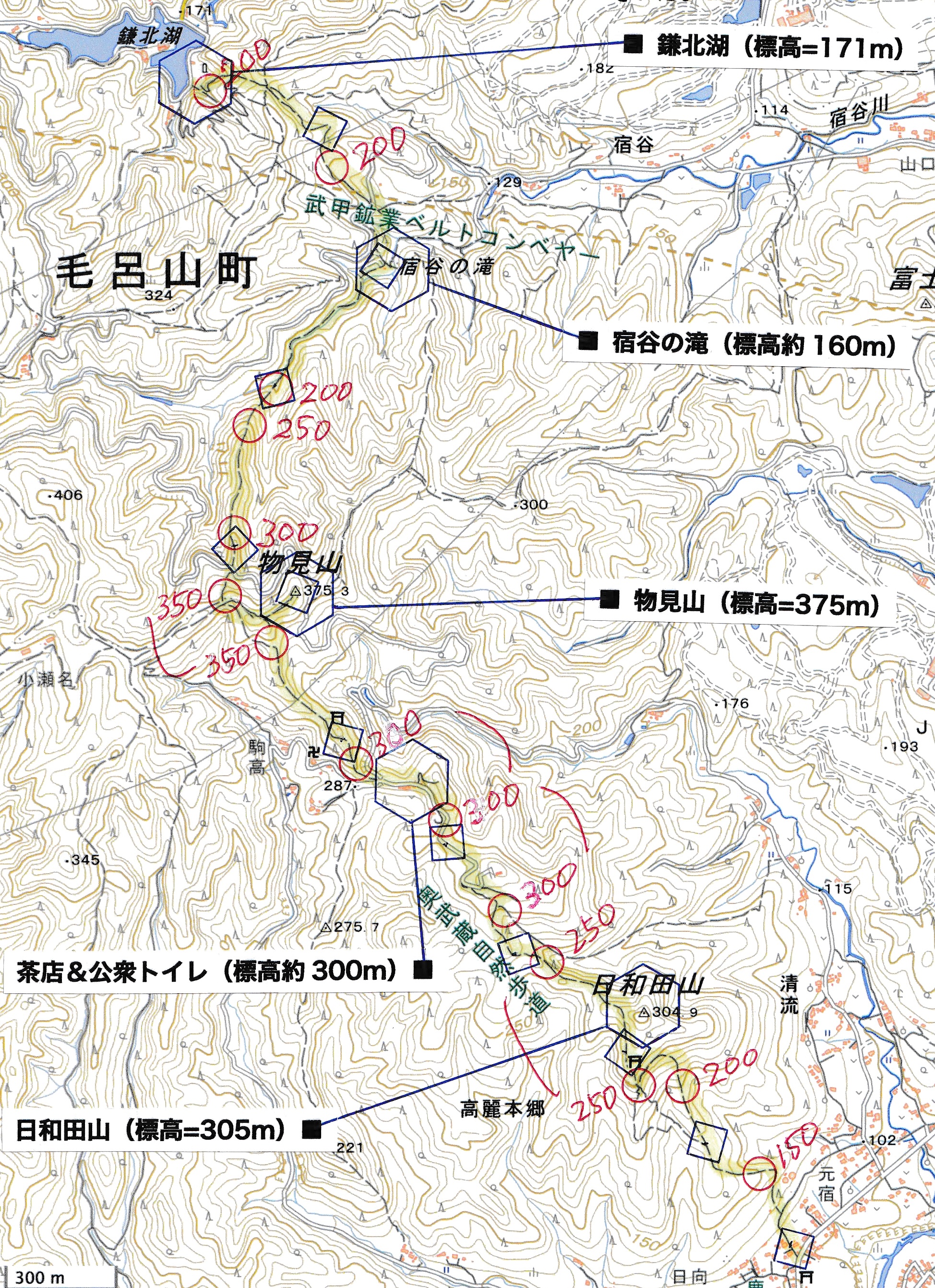 ────1025-40ごろ_宿谷(しゅくや)の滝で休憩(標高約160m) 1135-55ごろ_物見山山頂で休憩(標高=375m) ────1210-15ごろ_駒高(「ふじみや」は休業中)でトイレ休憩(標高約230m)