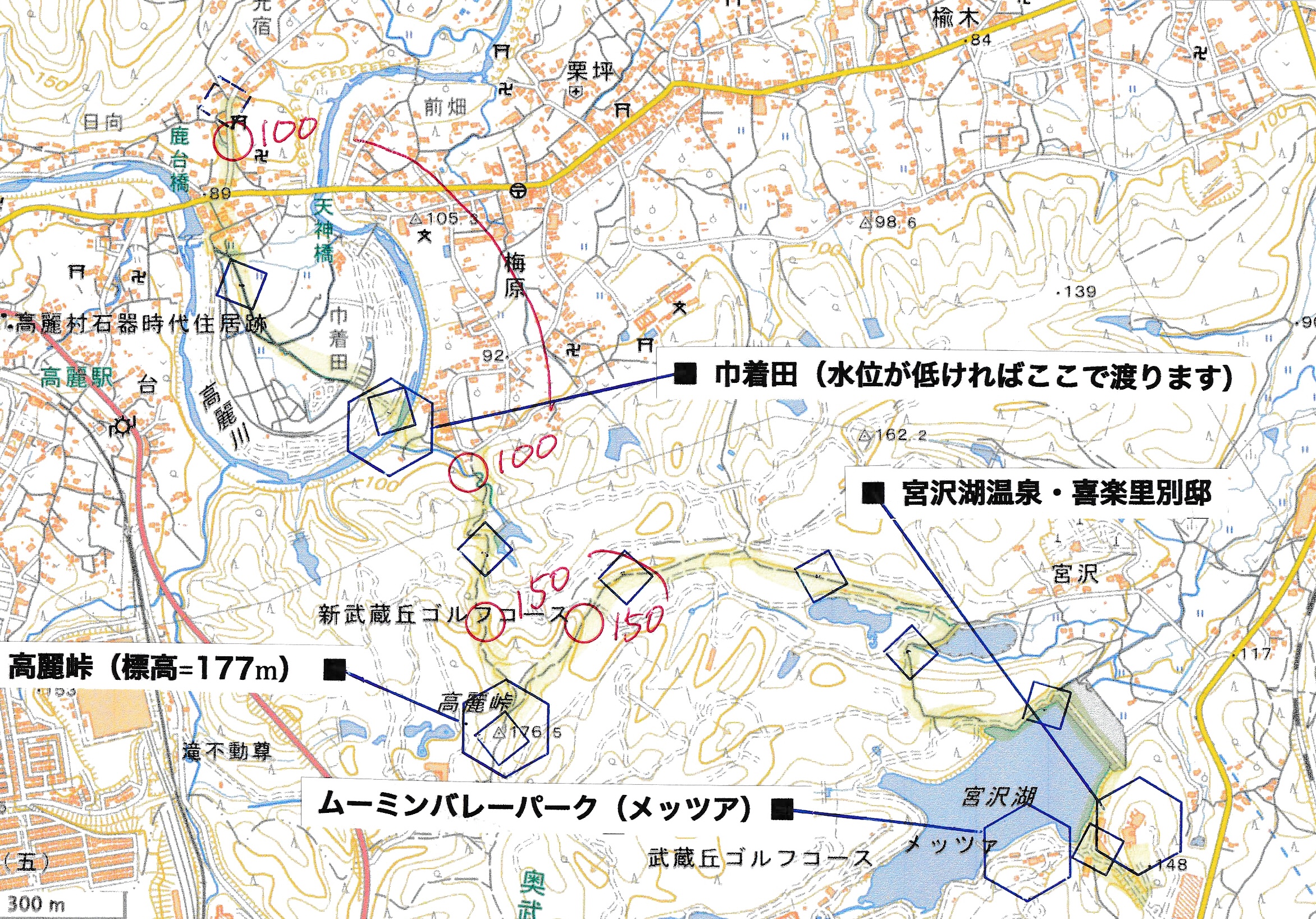 ────1350-1405ごろ_巾着田を横断 1405-15ごろドレミファ橋をわたって休憩(標高約90m) 1440-45ごろ_高麗(こま)峠で休憩 ・新武蔵丘ゴルフコースのフェンスに沿って下り ────1515ごろ_宮沢湖(標高約110m)