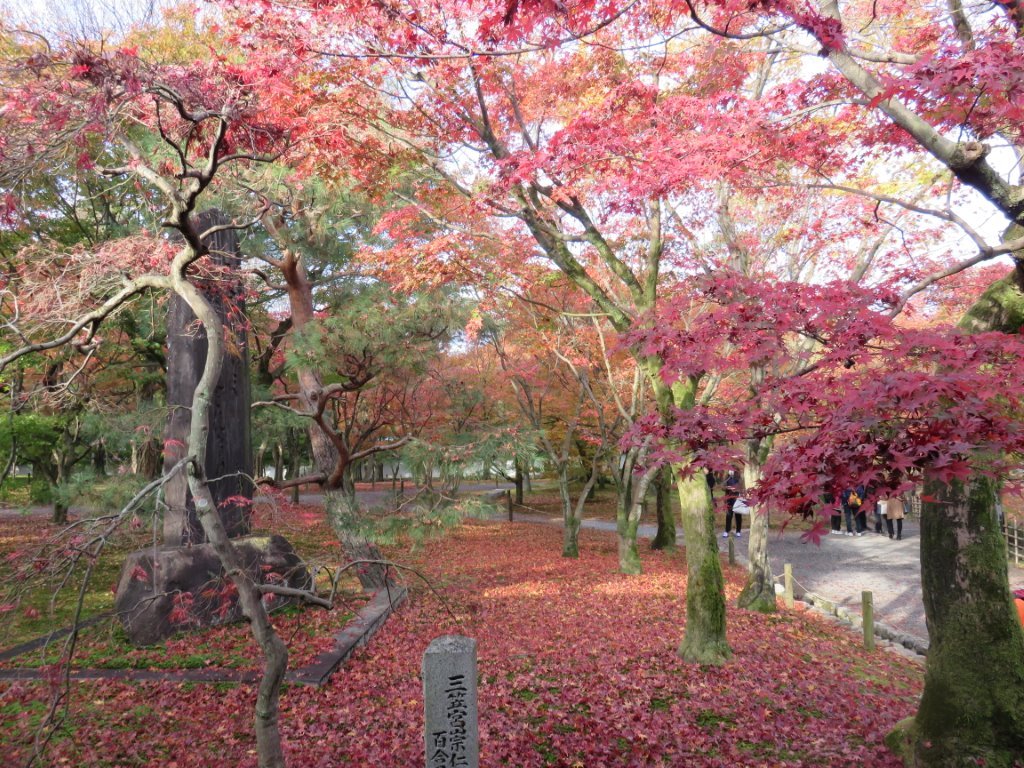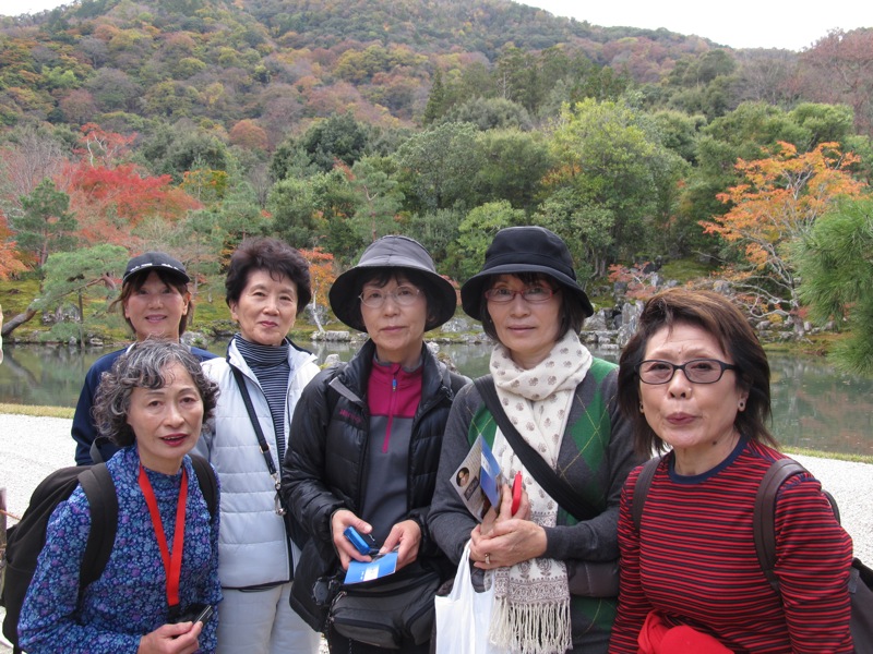 *紅葉のピークには京都市内はタクシーでも時間が読めないほどの渋滞になり、有名な寺社では門前での長時間待ちも覚悟しなければならないといわれます。それを覚悟で、メニューだけ豪華な計画を立てました。ついでに直径30cmほどの輪をひもで作って、全員のザックの背中につけました(実際にはほとんど必要がありませんでしたが)。その一日に私たち8人が見たもの、体験したものをレポートします。