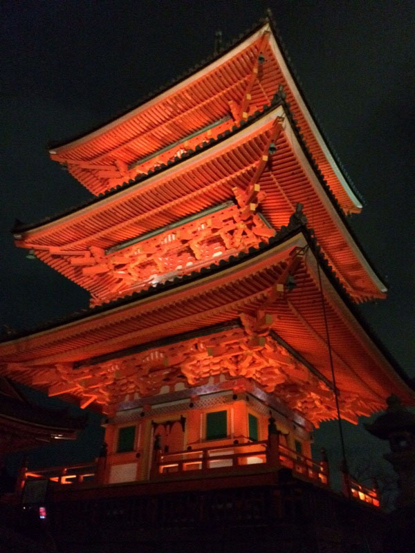 ライトアップされた清水寺の三重塔。朱色の塔は 昼間みるより 印象的だった。ここまで見られるなんて 流石 弾丸ツアー。