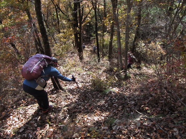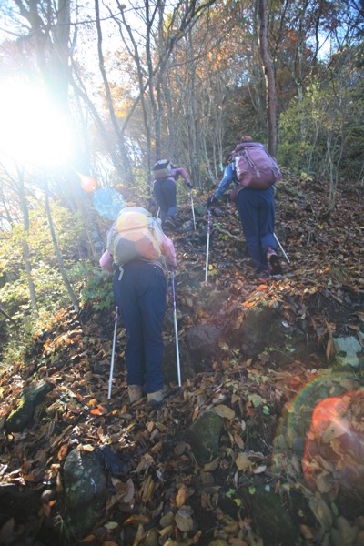 低い晩秋の陽射し。カサカサと落ち葉を踏み 気持ち良い尾根歩きが続いていく。